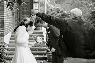 Beim Auszug aus dem Standesamt gab es jedoch noch ein Ärgernis. Zunächst hatten ja alle noch im Trauzimmer gratuliert und waren nach draußen gegangen. Schatzi-Moppel und ich kamen nach einer kleinen Pause am Schluss. Wir drei kamen also nichtsahnend und freudestrahlend aus der Tür und die Stufen heruntergeschwebt, als uns plötzlich Reis traf. Und zwar nicht nur ein paar Körnchen, sondern Kochbeutelweise.