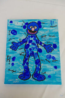 Zur Erinnerung gibt es natürlich nicht nur zahlreiche und wirklich einmal ausreichend viele Fotos, sondern auch ein liebevoll gestaltetes Gästebuch und einen \“Grobi-Baum\“. Ihr kennt ja sicher alle diese Hochzeits-Fingerabdruck-Bäumchen, die die Gäste gestalten. Moppels Schwester hatte so etwas mit mir als \“Baum\“ vorbereitet. Die Aufgabe war eigentlich denkbar leicht: Man sollte mit blauer Farbe seinen Fingerabdruck in den Grobi-Umriss machen und neben dem Umriss unterschreiben. Leider hat das nicht bei allen geklappt und so gibt es eben auch Unterschriften im Umriss und Fingerabdrücke daneben. Irgendwie habe ich auf diese Weise auch Ohren bekommen. Seit wann haben denn Grobis Ohren??? Da muss wohl der eine oder andere noch mal ein paar Sesamstraßen-Folgen schauen.