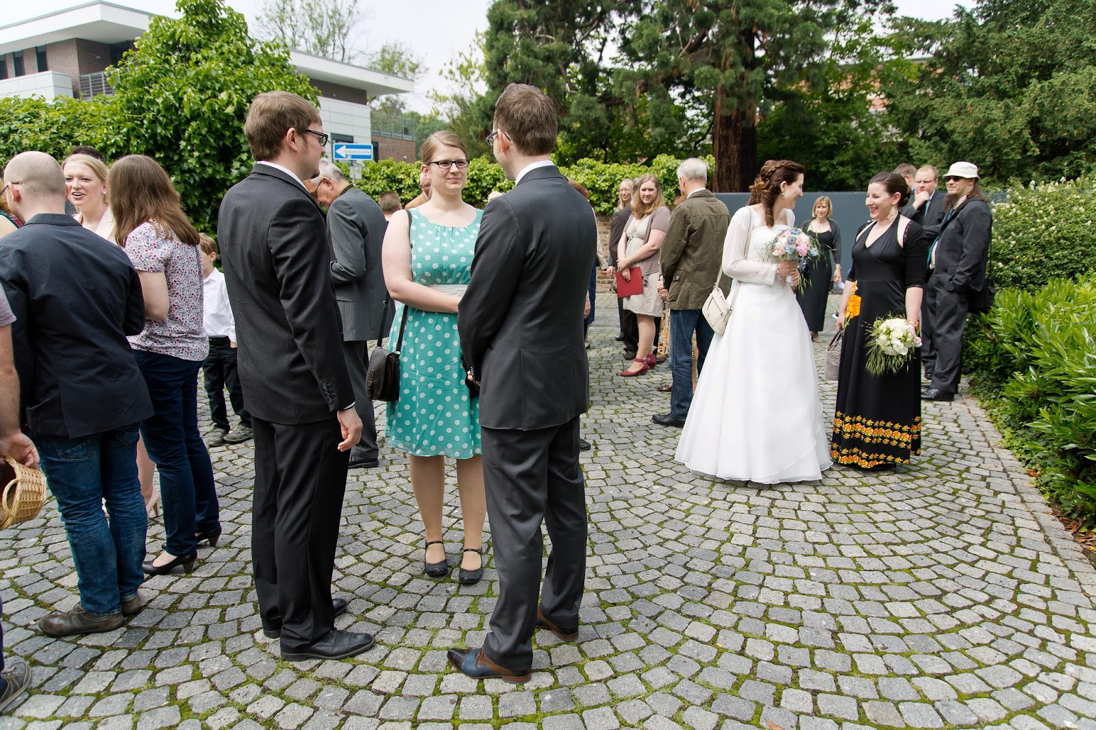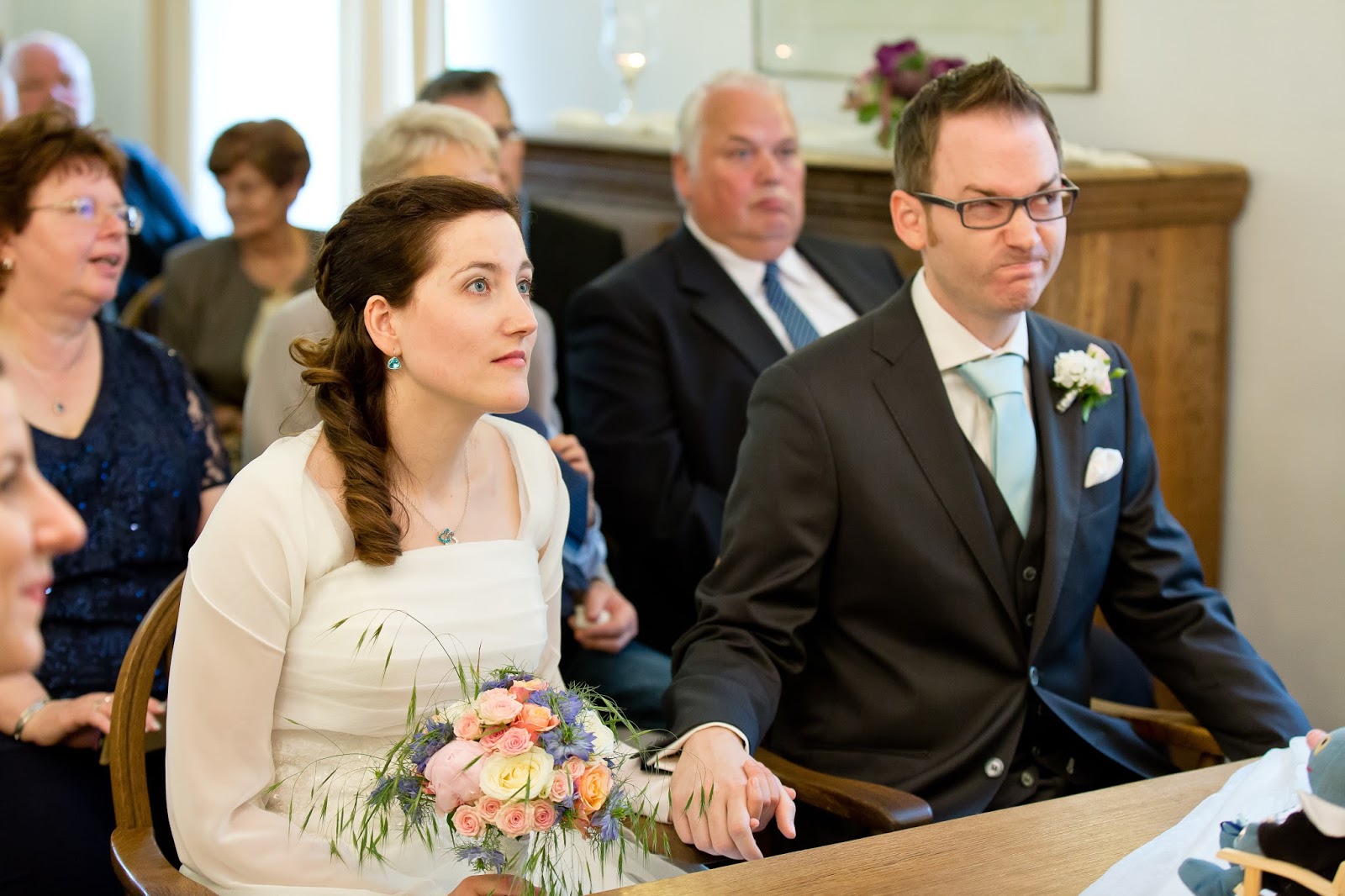 Dann kam direkt der zweite Streich. Geplant war, dass der Moppel im Standsamt im Trauzimmer steht und das Schatzi von ihrem Vater hereingeführt wird. Allerdings waren das Schatzi und ihre Trauzeugin schon recht früh am Standesamt, es war weit und breit noch niemand zu sehen. Um das Auto zu parken (das ja nicht im Weg herumstehen konnte), musste das Schatzi aber vorher aussteigen. Und als sie gerade ausgestiegen war und sich noch nicht überlegt hatte, wo sie sich am besten verstecken könnte, kam der Moppel um die Ecke. Perfektes Timing. Verstecken unmöglich. Aber eigentlich war das gar nicht so schlecht. So konnten sie die Gäste vor dem Standesamt gemeinsam begrüßen, einander vorstellen und schließlich zusammen reingehen. „Heaven“ wurde natürlich trotzdem gespielt und war auch hierfür sehr passend.