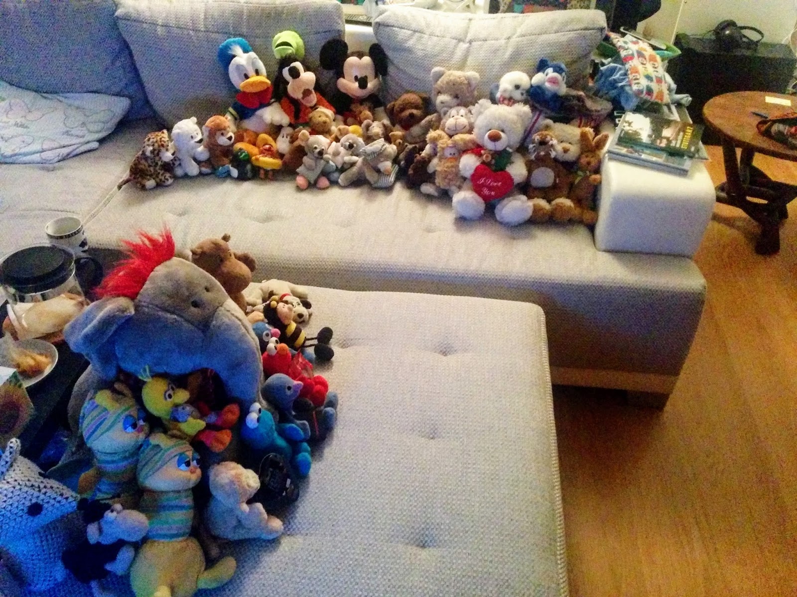 An einem Tag Ende November 2015 war das Schatzi dann mit eben dieser eben erwähnten, inzwischen aus Neuseeland zurückgekehrten Freundin abends zum Essen verabredet und hatte danach zwei Glühwein intus. Ihr erkennt das Muster. Als sie beschwipst zur Tür hereinwankte, traute sie wohl ihren Augen nicht. Der Moppel und ich hatten etwas vorbereitet! Wir hatten sämtliche Kuscheltiere aus der ganzen Wohnung (auch aus der Kuscheltierschublade, die ich später noch näher erläutern werde) zusammengetragen und auf der Couch verteilt. Die ist ja sonst auch schon ganz gut gefüllt, aber da war es richtig voll und kuschlig, aber ist ja klar, dass alle dabei sein wollten und mussten.