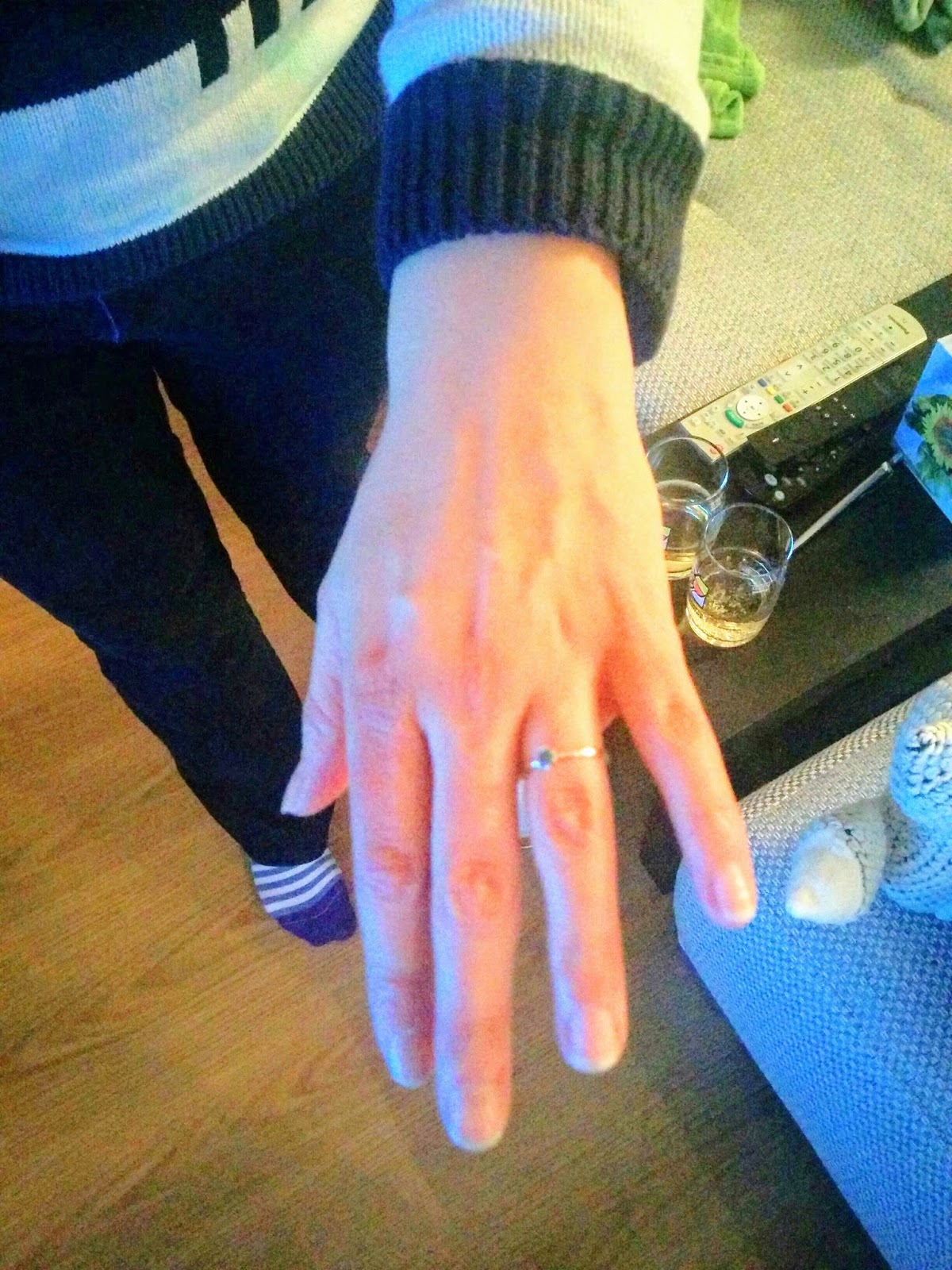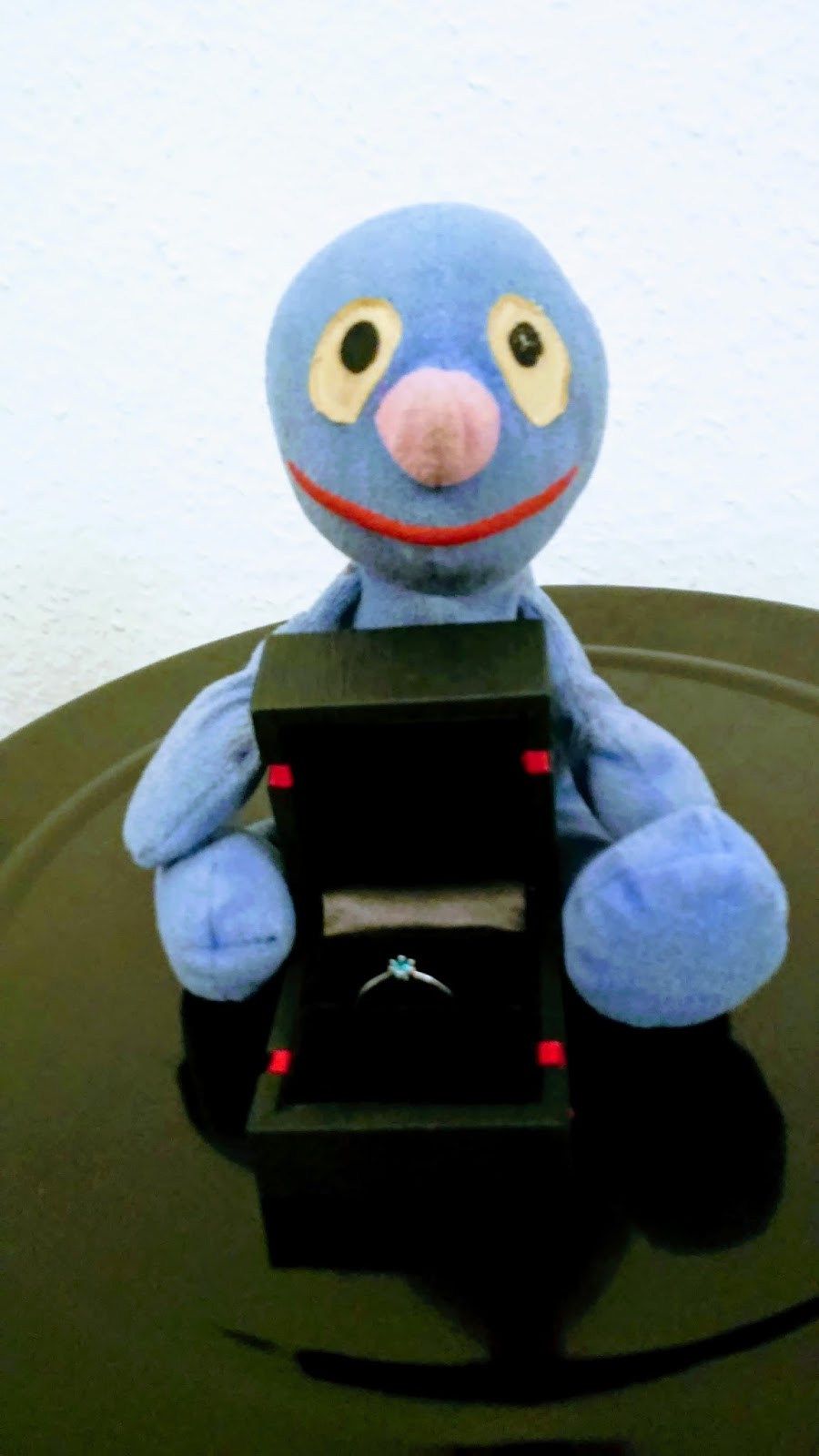 Ich hatte den Ring (wir hatten natürlich einen Ring mit einem blauen Stein ausgesucht!) in der Schachtel auf meinem Schoß, Elmo die Gummibärchen und Krümel die Pralinen. Ganz erstaunlich, dass nach dem Antrag noch welche da waren. Ich hatte eigentlich erwartet, dass der Krümel vor lauter Aufregung alle schon vorher auffrisst. Außerdem war noch eine Flasche Sekt bereitgestellt, wir konnten ja nicht ahnen, dass das Schatzi schon beschwipst nach Hause kommt. Okay, vielleicht hätten wir es erahnen können, aber wir haben an zu viele andere Sachen gedacht, waren aufgeregt und außerdem gehört ein Gläschen Sekt zu einem Antrag jawohl dazu.