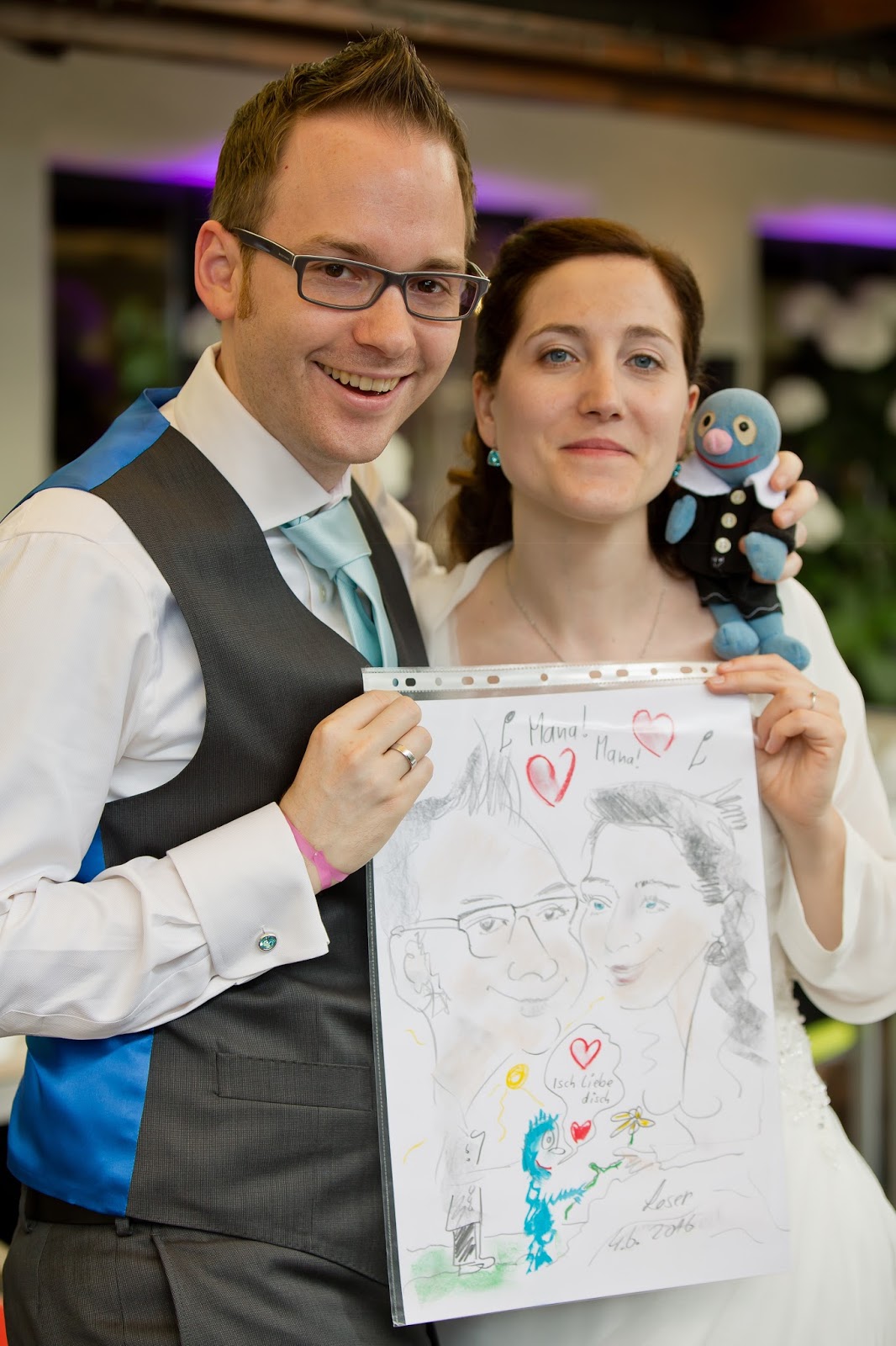 Während der Feier gab es noch zwei kleine \“Unglücke\“. Das eine war der Schnellzeichner, den Schatzi-Moppel engagiert hatten. Leider fiel den beiden erst eine ganze Weile später auf, dass dieser nicht zur vereinbarten Zeit erschienen war, weil natürlich niemand eine Uhr trug und man bei so einer Feier ja auch nicht unbedingt auf die Uhrzeit achtet (zumindest nicht am Nachmittag, wo noch voll viel Zeit für alles bleibt). Glücklicherweise wurde der Schnellzeichner aber gefunden – bei der zeitgleich stattfindenden Hochzeit im Nebensaal der Gaststätte. Er hatte sich dort einfach hingesetzt, niemanden angesprochen und zu malen begonnen. Das Brautpaar dachte vermutlich, er wäre ein Geschenk von einem der Gäste. Er wurde dann jedenfalls herüberbeordert und musste bei uns weitermalen. Und natürlich die Zeit nachsitzen, die er (bei uns) zu spät gekommen ist. Der Schnellzeichner war zwar ein typischer Künstler und deshalb ein ziemlich komischer Kauz (niemand wusste, ob er mit sich selbst spricht oder mit demjenigen, den er grad gemalt hat), aber es sind wirklich schöne Bilder entstanden und wir drei zusammen wurden sehr treffend verewigt. Das Bild hängt jetzt an einem Ehrenplatz im Wohnzimmer.