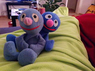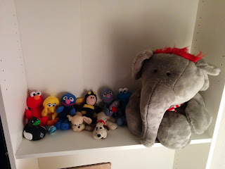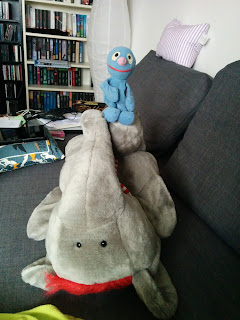 Noch in der eigenen kleinen Wohnung vom Schatzi in Stuttgart-Feuerbach (wo sie immerhin ein Dreivierteljahr gewohnt hat) kamen nacheinander einige Kuschelfreunde dazu: Zunächst Fischi, Bibo, Elmo und Krümel im erwähnten 4er Pack. Fischi wurde ja als Ersatz-Grobi bestellt und da es ihn nur zusammen in einem Pack mit den anderen dreien gab, kamen die halt mit. Da konnte das Schatzi einfach nicht wiederstehen. Wie schon erwähnt, sieht der Fischi ganz anders aus als ich, trotzdem haben wir ihn gleich liebgewonnen, wie er so traurig aus der (nicht vorhandenen) Wäsche schaut und immer ein wenig verängstigt von der großen weiten Welt wirkt. Einfach süß.
