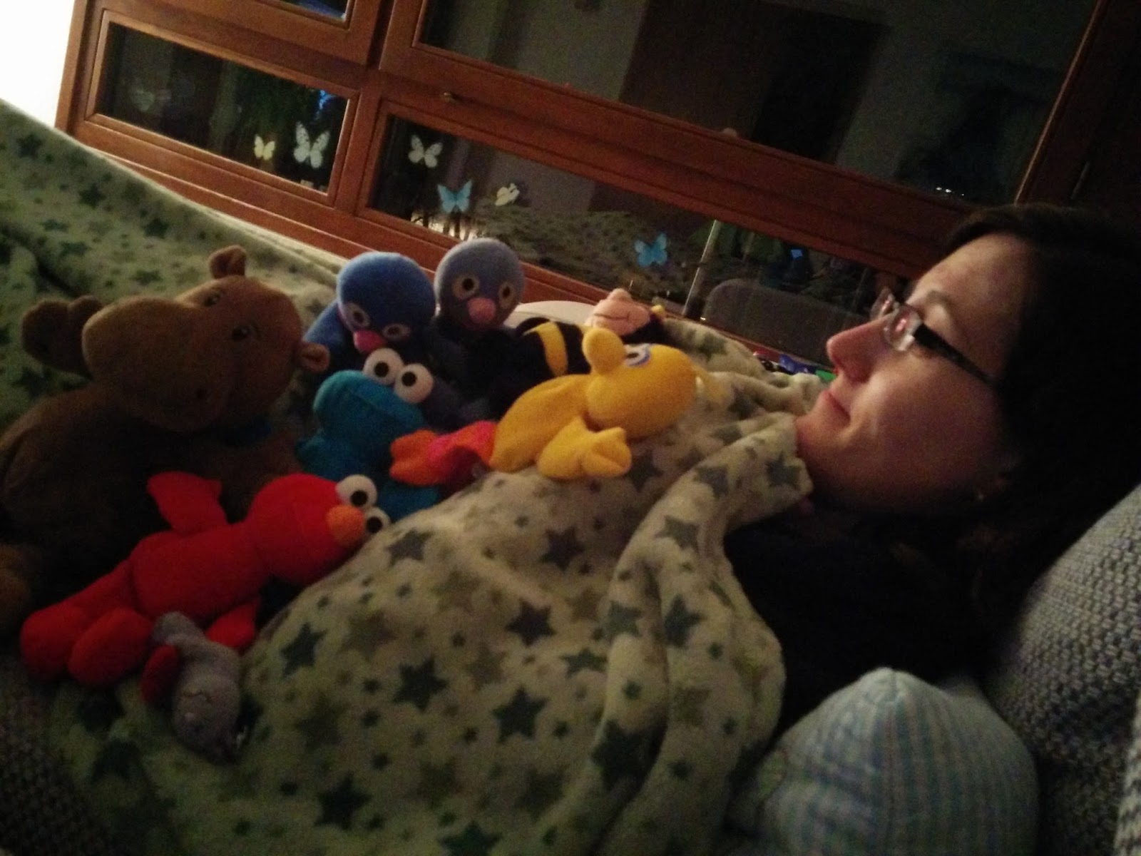 Noch in der eigenen kleinen Wohnung vom Schatzi in Stuttgart-Feuerbach (wo sie immerhin ein Dreivierteljahr gewohnt hat) kamen nacheinander einige Kuschelfreunde dazu: Zunächst Fischi, Bibo, Elmo und Krümel im erwähnten 4er Pack. Fischi wurde ja als Ersatz-Grobi bestellt und da es ihn nur zusammen in einem Pack mit den anderen dreien gab, kamen die halt mit. Da konnte das Schatzi einfach nicht wiederstehen. Wie schon erwähnt, sieht der Fischi ganz anders aus als ich, trotzdem haben wir ihn gleich liebgewonnen, wie er so traurig aus der (nicht vorhandenen) Wäsche schaut und immer ein wenig verängstigt von der großen weiten Welt wirkt. Einfach süß.
