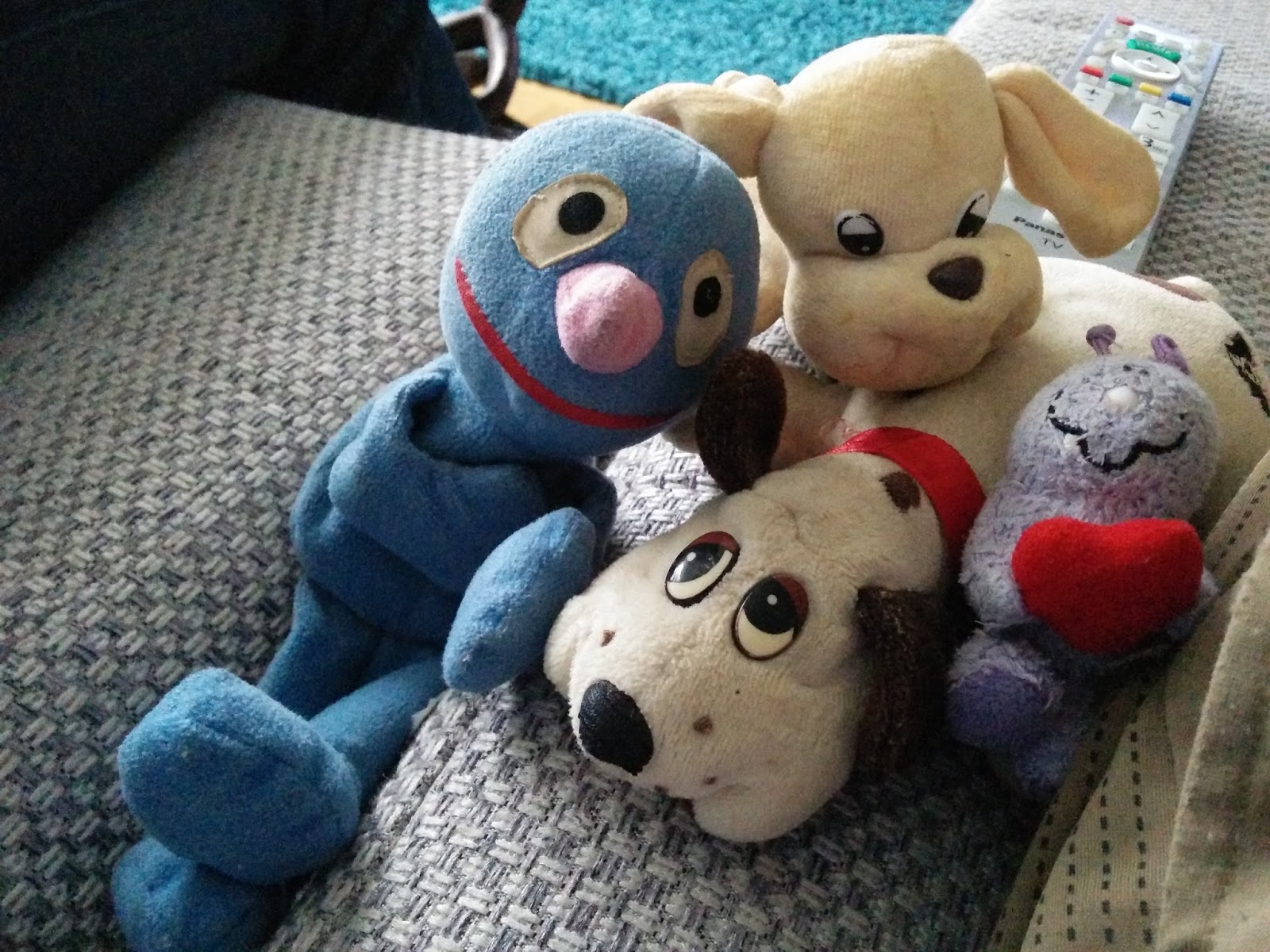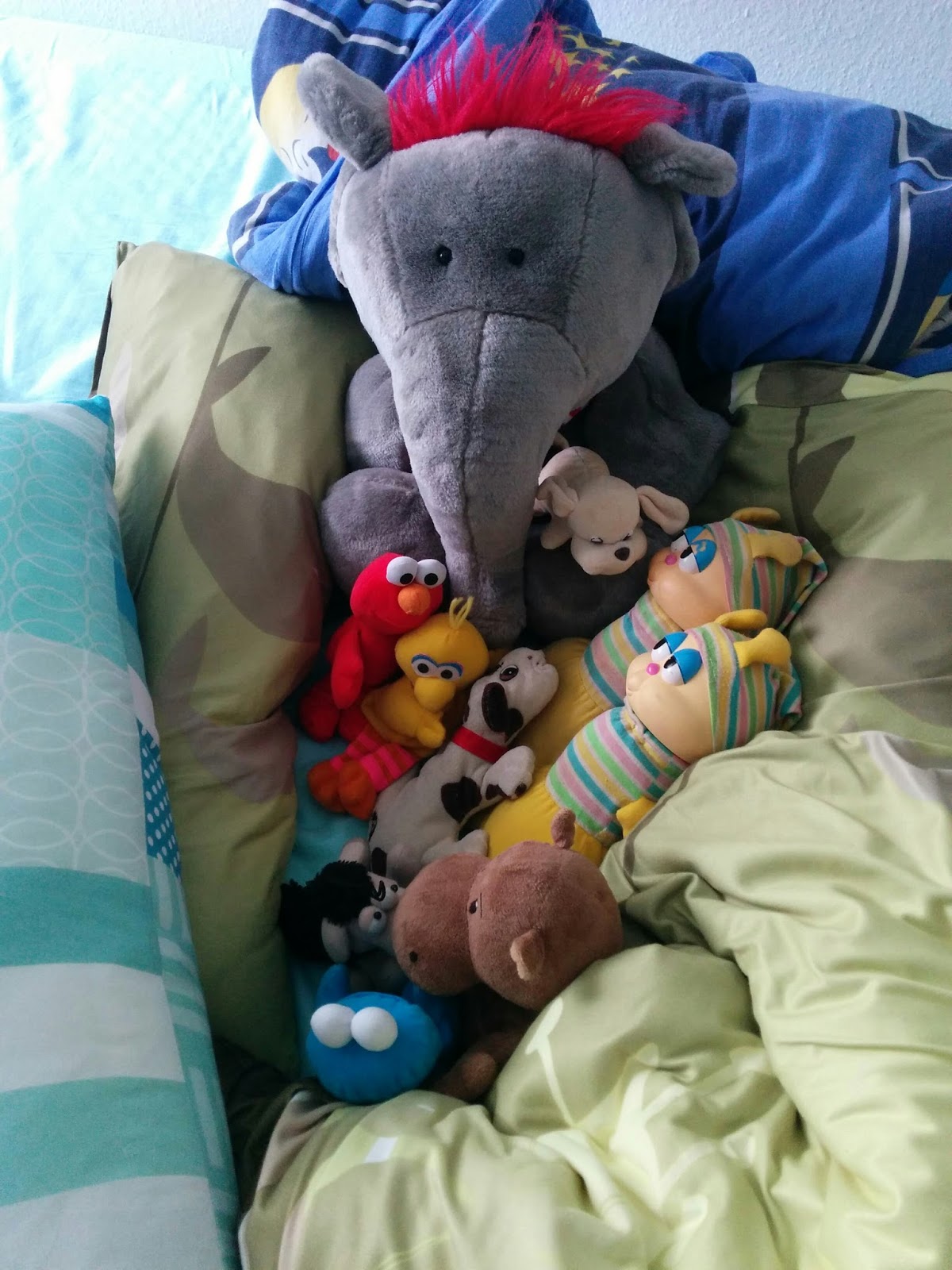 Trotz allem muss jetzt jedenfalls Schluss sein. Sonst kenne ich nachher gar nicht alle richtig oder ich habe nicht genug Zeit, um mit jeden ausgiebig zu knuddeln und zu quatschen. Also müssen Schatzi-Moppel ihre Kuscheltier-Gelüste ein wenig zurückfahren und einfach mal die kuscheln, die da sind. Das sind ja schließlich genug. Nach dem verhängten Kuscheltier-Embargo haben sich wie erwähnt noch Raffi und Robbie eingeschlichen. Die sind aber so klein, dass sie im Grunde nicht ins Gewicht fallen und von mir ohne weiteres Murren akzeptiert wurden. Ich bin mal gespannt, wie lange der aktuelle Stand anhält bzw. wann das nächste Kuscheltier gerettet wird oder nachgelaufen kommt.