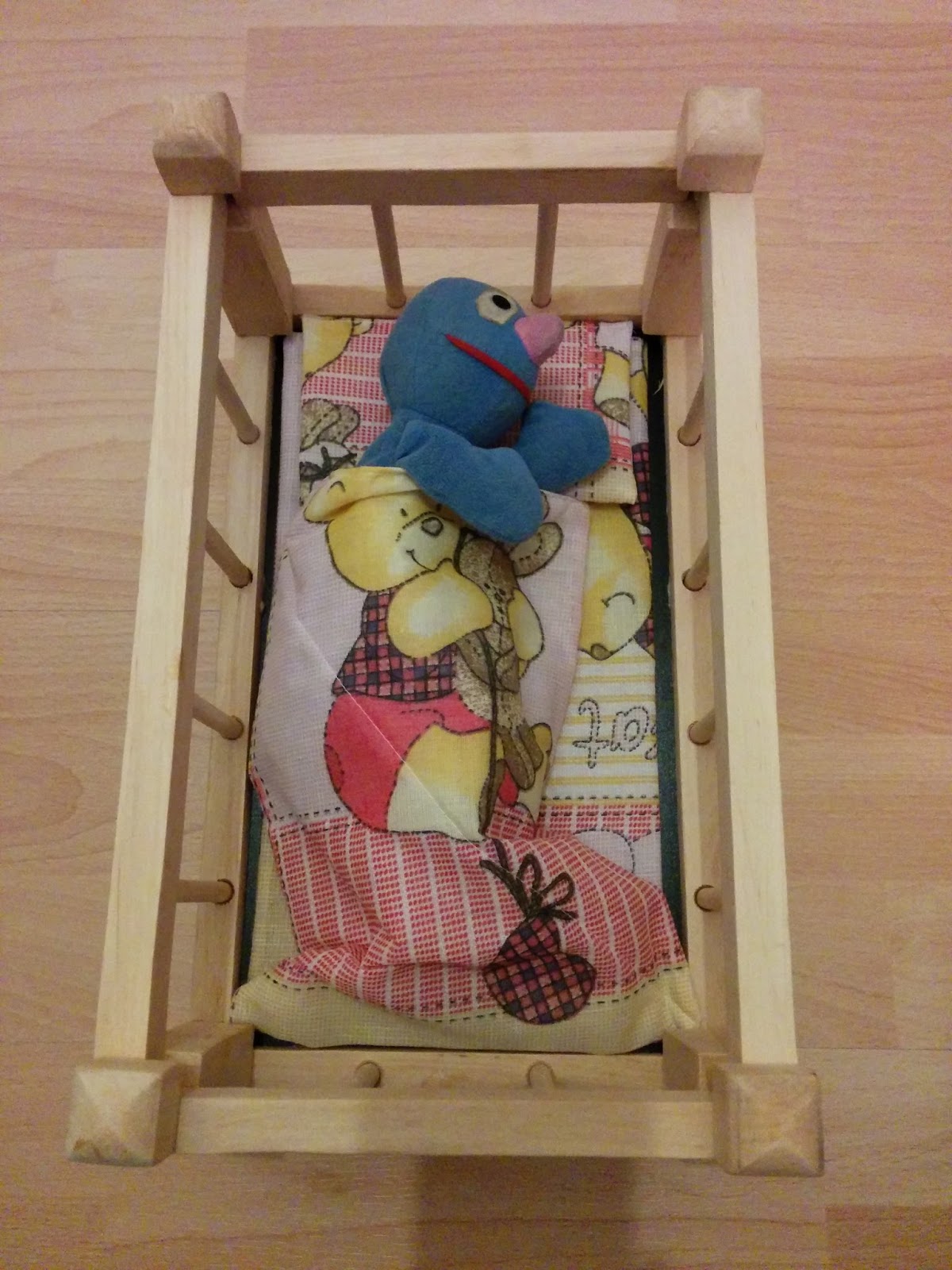 Nach dem Vierer-Sesamstraßen-Einzug wurden Kuschel und das Bienchen \“gefunden\“. Das Schatzi hat vor dem Umzug in die gemeinsame Wohnung ihren Krimskrams zusammen gepackt und beide in irgendwelchen dekorativen Kisten gefunden. Beide wurden daher aufgenommen und getröstet. Ungefähr zu dieser Zeit muss auch mein Bettchen bestellt und geliefert worden sein. Es war schon eine schöne Vorstellung, nachts mit bei Schatzi-Moppel im Schlafzimmer zu sein, aber alleine in meinem Bettchen? In das große Bett durfte ich nachts nicht, damit mich nicht versehentlich jemand im Schlaf überrollt. Viel zu gefährlich. Aber so konnte ich gleich ein Kuscheltier mit ins (eigene) Bettchen nehmen und war nicht alleine.
