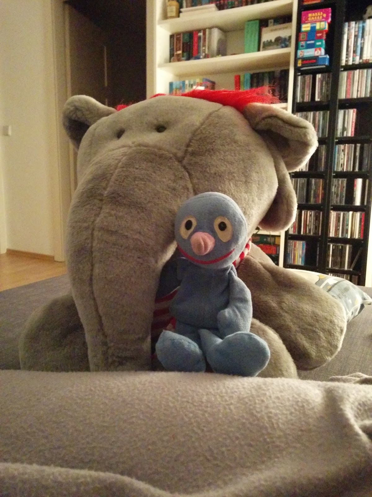 Eine Weile nach dem Umzug wurden Emil und Plups aus der Kuscheltier-Schublade befreit. Diese befindet sich im Gästezimmer am Gästebett und beherbergt sämtliche alten Kuscheltiere vom Schatzi, von denen sie sich nicht trennen kann. Diese sind in der Umzugskiste mit uns gereist, wurden aber nicht auf die Couch gesetzt, sondern in dieser Schublade zum gegenseitigen Kuscheln verstaut. Zum richtigen Verständnis: Diese vielen Kuscheltiere gab es also schon, sie wurden aber vor uns versteckt. Der Moppel fand jedenfalls Emil und Plups aber so süß (zu Recht!), dass er sie mit auf die Couch gebracht hat. Eine wirklich gute Wahl, denn sie haben die Kuschelrunde nachhaltig positiv verstärkt. Aus dieser Kuscheltierschublade stammt auch das Äffchen, aber ich kann mich nicht mehr so richtig erinnern, wann es zu uns auf die Couch gekommen ist. Gefühlt war es schon immer da.