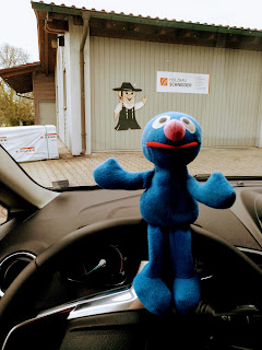 Wie sie später erzählt hat, hat sie schon im Parkhaus den ersten Stunt gemacht und ist von ihrem Platz neben dem Spiegel erstmal abgestürzt und quer durchs Auto gesegelt. Passiert ist ihr natürlich nichts, aber Fischi war erstmal ein wenig erschrocken.