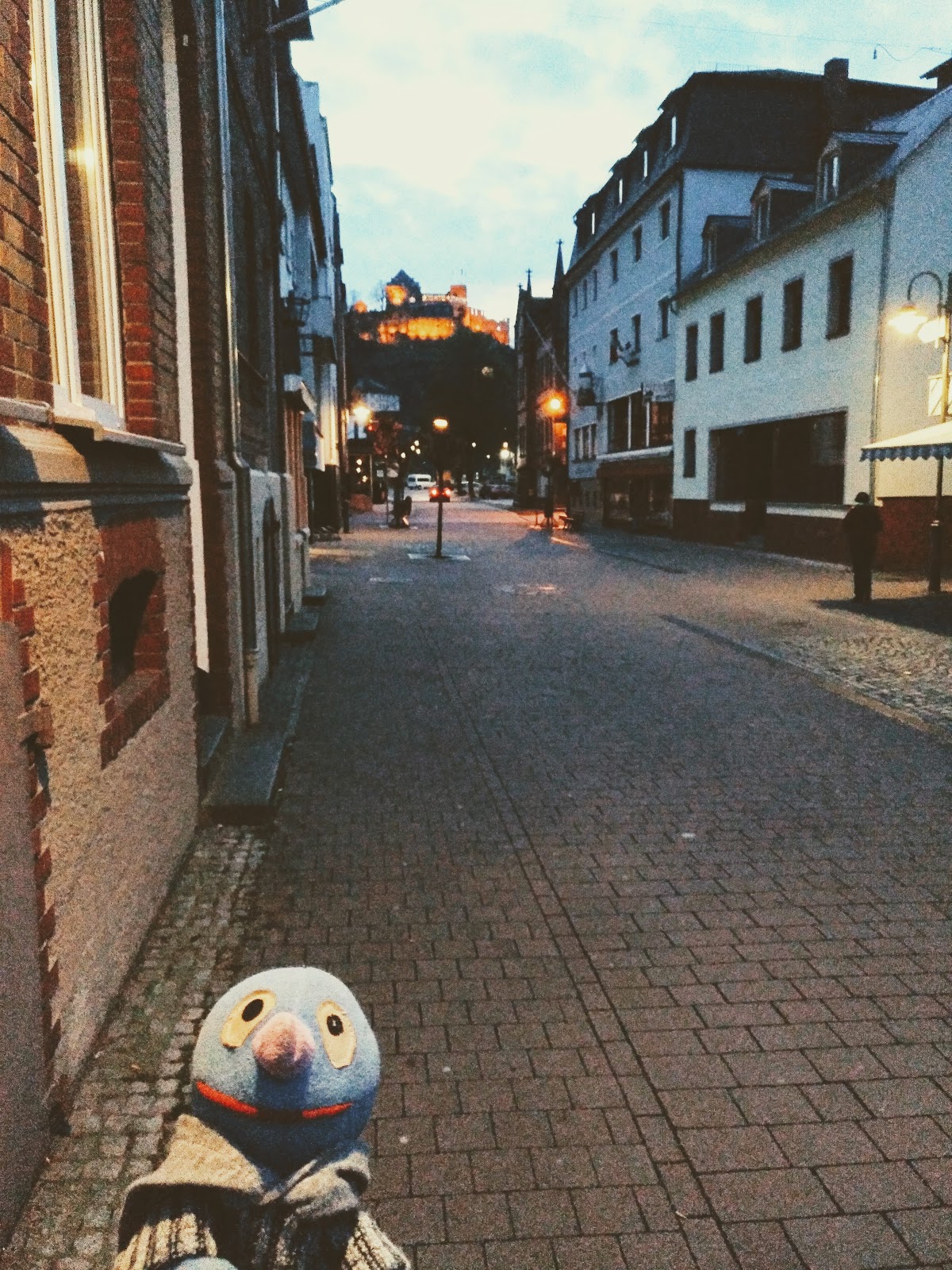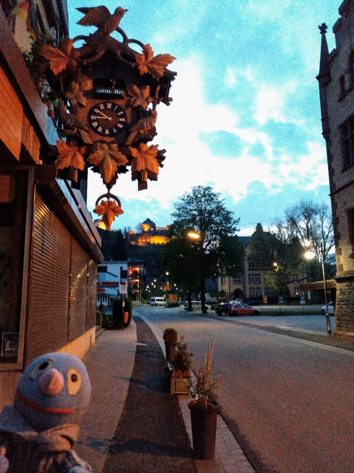 Als wir aus dem Imbiss wieder herauskamen, war es allerdings quasi dunkel. Wir haben noch schnell unbekannterweise die Burg Rheinfels und die größte freihängende Kuckucksuhr der Welt fotografiert, sind dann zum Auto zurück gegangen und noch ein Stück am Rhein entlang zurück zur Autobahn gefahren.