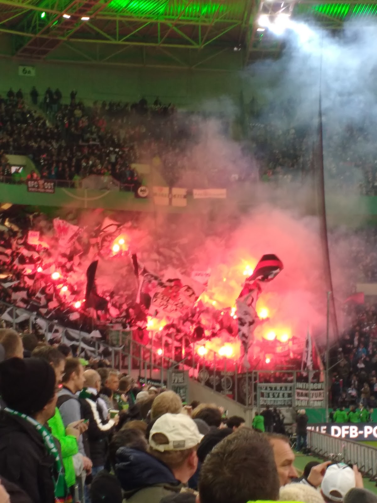 Zu Beginn des Spiels zündelten die Frankfurter ordentlich Pyrotechnik, sodass Basti beschlossen hat, den Rest des Spiels lieber hörend in der Tasche zu verbringen. Ich habe ihm beigepflichtet, denn das mache ich ja normalerweise genauso.
