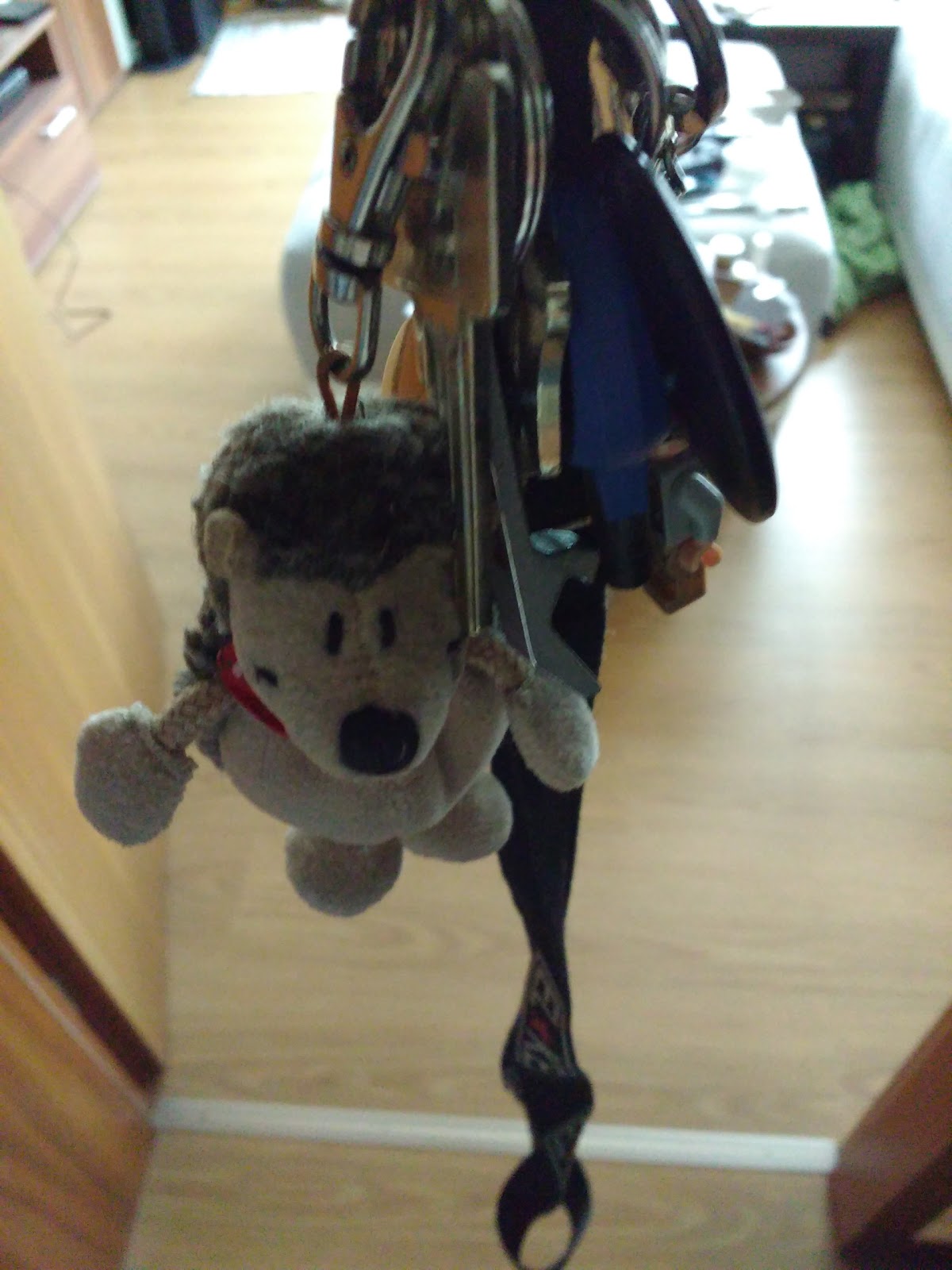 Die Wahl fiel schließlich auf Basti, den Igel. Basti hat ja vor seiner kürzlich erfolgten Auswanderung zu uns, in Thüringen als Spion gearbeitet. Dadurch ist er natürlich ideal vorgebildet. Außerdem ist er klein und hat einen Schlüsselanhängerhaken. Perfekt. Und einverstanden war er auch.
