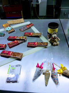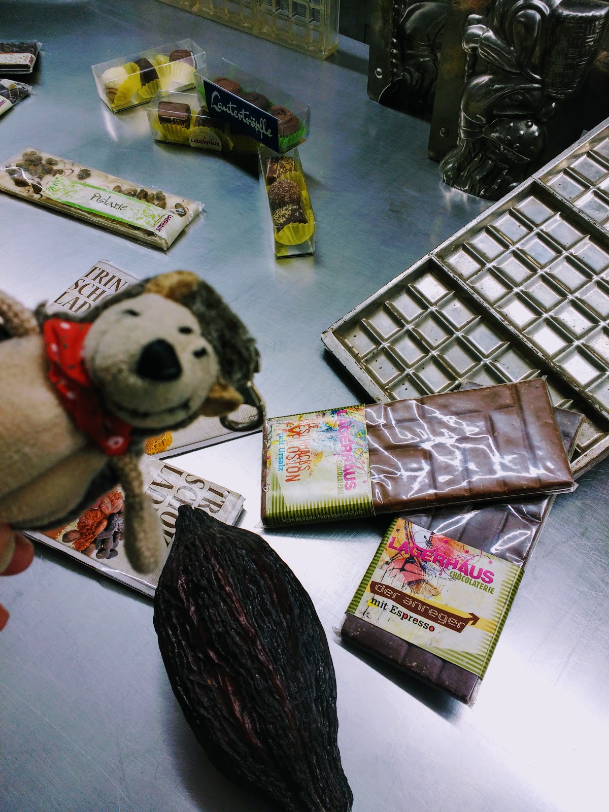 In dieser Küche war ein recht junger Mitarbeiter bemüht, den Anwesenden möglichst viel über die Geschichte der Schokolade zu erzählen. Das fand Basti alles nicht so interessant, hat aber ein paar Fakten für Krümel behalten und für einige Fotos für ihn posiert.