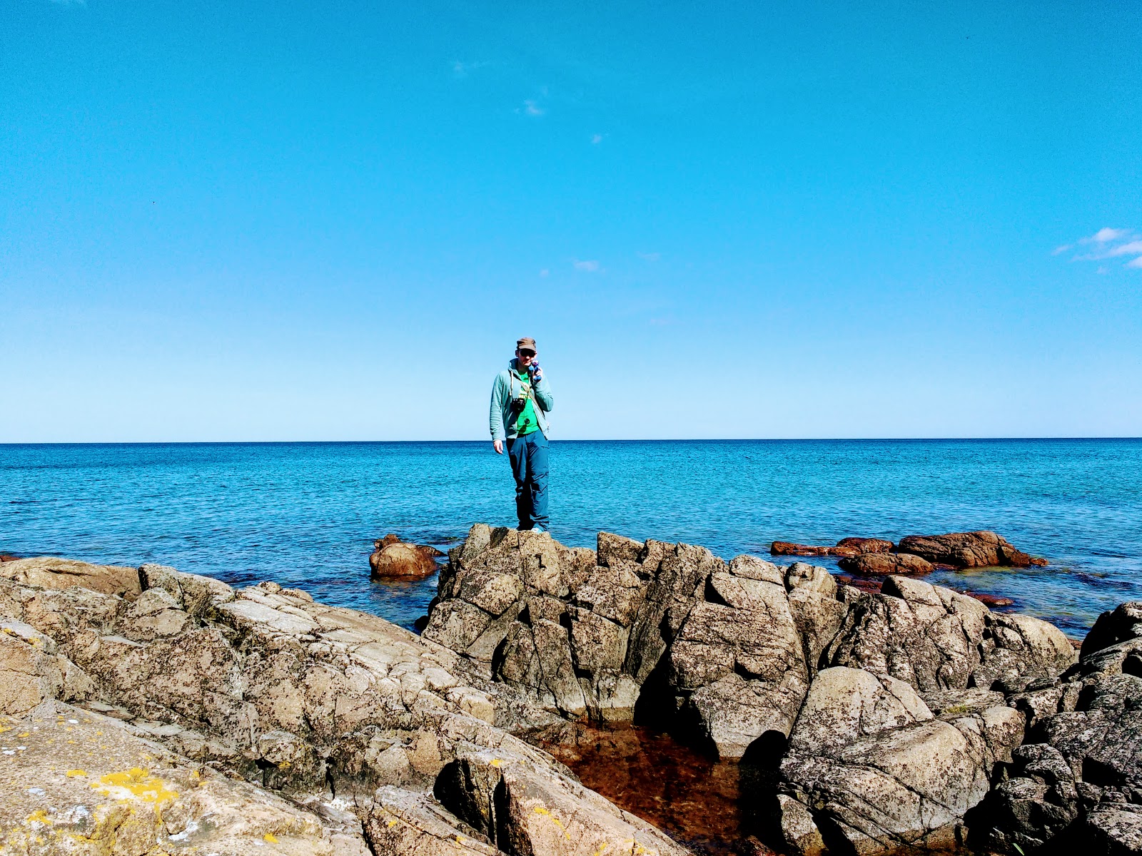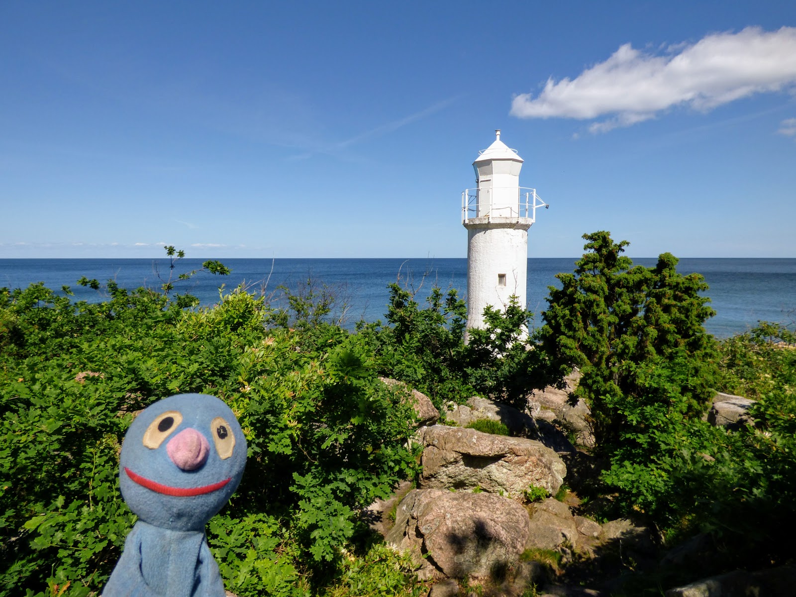 Der Weg führte uns zunächst weiter durch den Wald bis zum Nordeingang des Parks, dort schlug er einen Bogen und führte uns – weiter durch Wald – zu einem kleinen Leuchtturm und schließlich an einen Steinstrand am Meer.