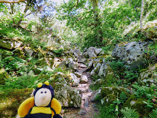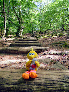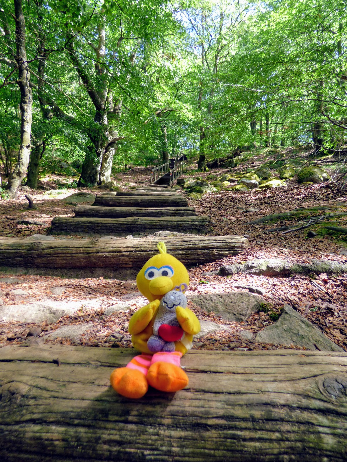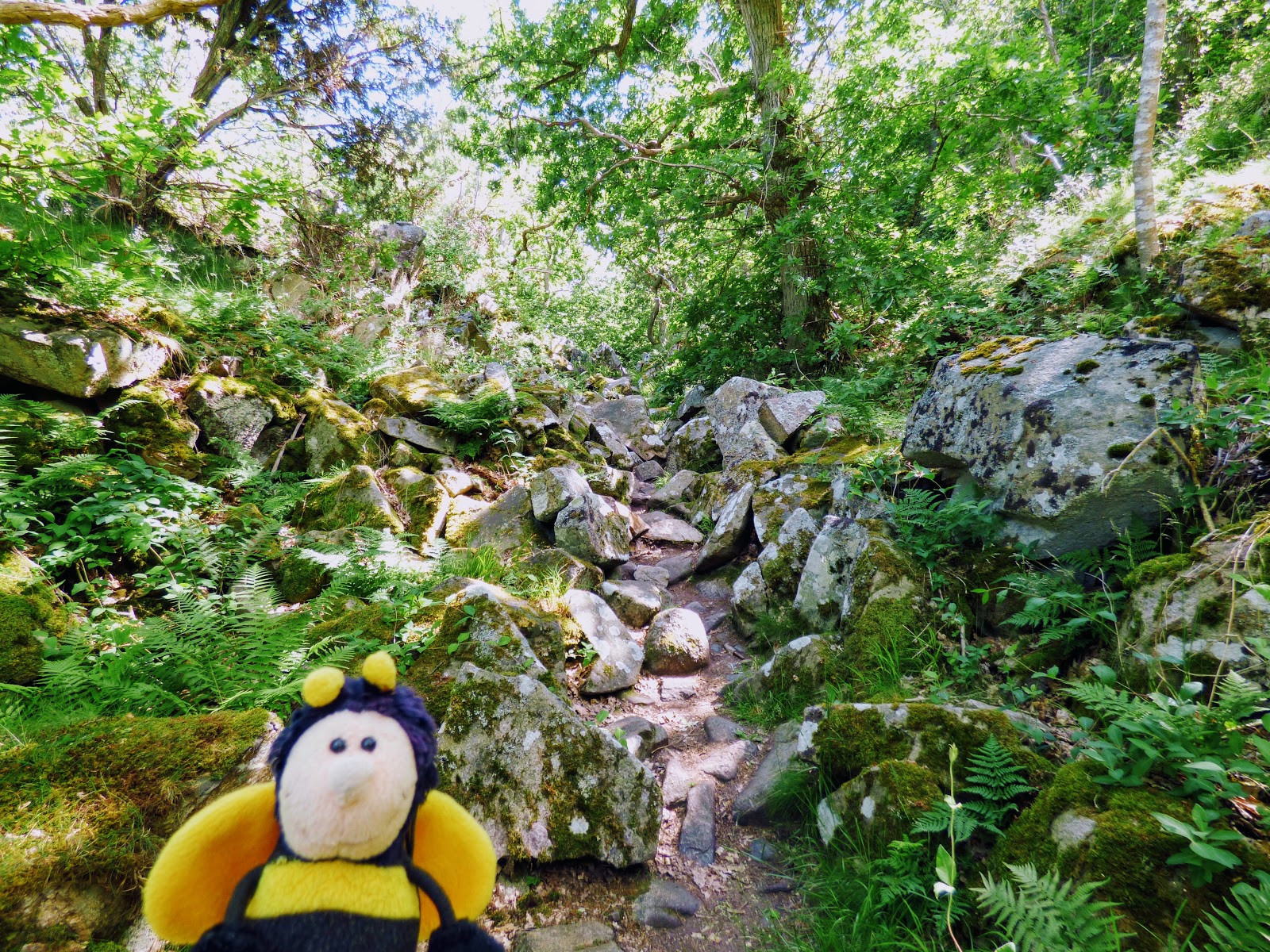 Im Anschluss suchten wir den weißen Verbindungsweg, um wieder zum gelben Rundwanderweg zu gelangen. Der Verbindungsweg war eine recht steile Holztreppe, die wir uns langsam hinunterwagten.