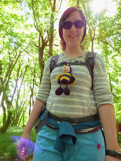 Sie drehte also vollkommen unachtsam die (gut vorgeschüttelte) Wasserflasche auf – hat dabei vermutlich die Aussicht genossen und nicht auf die Flasche geschaut – und wurde ohne Vorwarnung komplett geduscht. Herrje, war das lustig. Als wir den ersten Lachanfall überwunden hatten, fiel uns auf, dass das Bienchen immer noch vor dem Schatzi herum baummelte und ebenfalls ganz ordentlich nass geworden war. Das Bienchen fand das aber nicht so schlimm, da es recht warm war und es ohnehin ein unbeschwerter Typ ist. Glück gehabt.