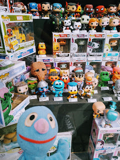 Unterwegs stolperten wir an einem Comicladen vorbei, in dessen Schaufenster allerlei Actionfiguren von (nicht nur, aber überwiegend) Superhelden standen. Darunter waren auch ein Supergrobi und ein Krümelmonster. Nach kurzer Diskussion erstand das Schatzi ein Krümelmonster, das schon seine eigenen Kekse dabei hatte. Clever eigentlich.