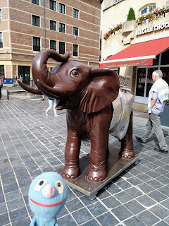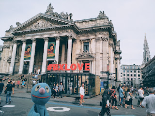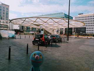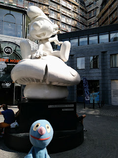 In Brüssel angekommen starteten wir unsere Speed-Sightseeing-Tour am Hauptbahnhof. Die ersten Meter um den Bahnhof herum waren wohl nicht besonders empfehlenswert und wurden von Schatzi-Moppel schnellstmöglich passiert. Als ich dann schließlich aus der Tasche geholt wurde, sah ich mich einem überlebensgroßen Riesenschlumpf gegenüber.