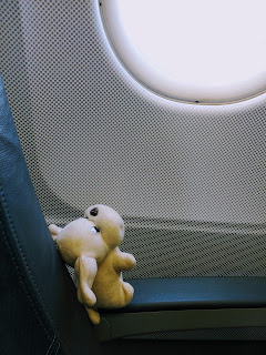 Als diese Probleme dann endlich behoben waren, ging es los. Dabei stellte sich heraus, dass weder Knuffi noch Elmo bisher geflogen waren und ein wenig Angst hatten. Sie wurden also aus der Tasche geholt und durften mit Schatzi-Moppel während des Fluges kuscheln. Beide haben sogar mutig aus dem Fenster geschaut.