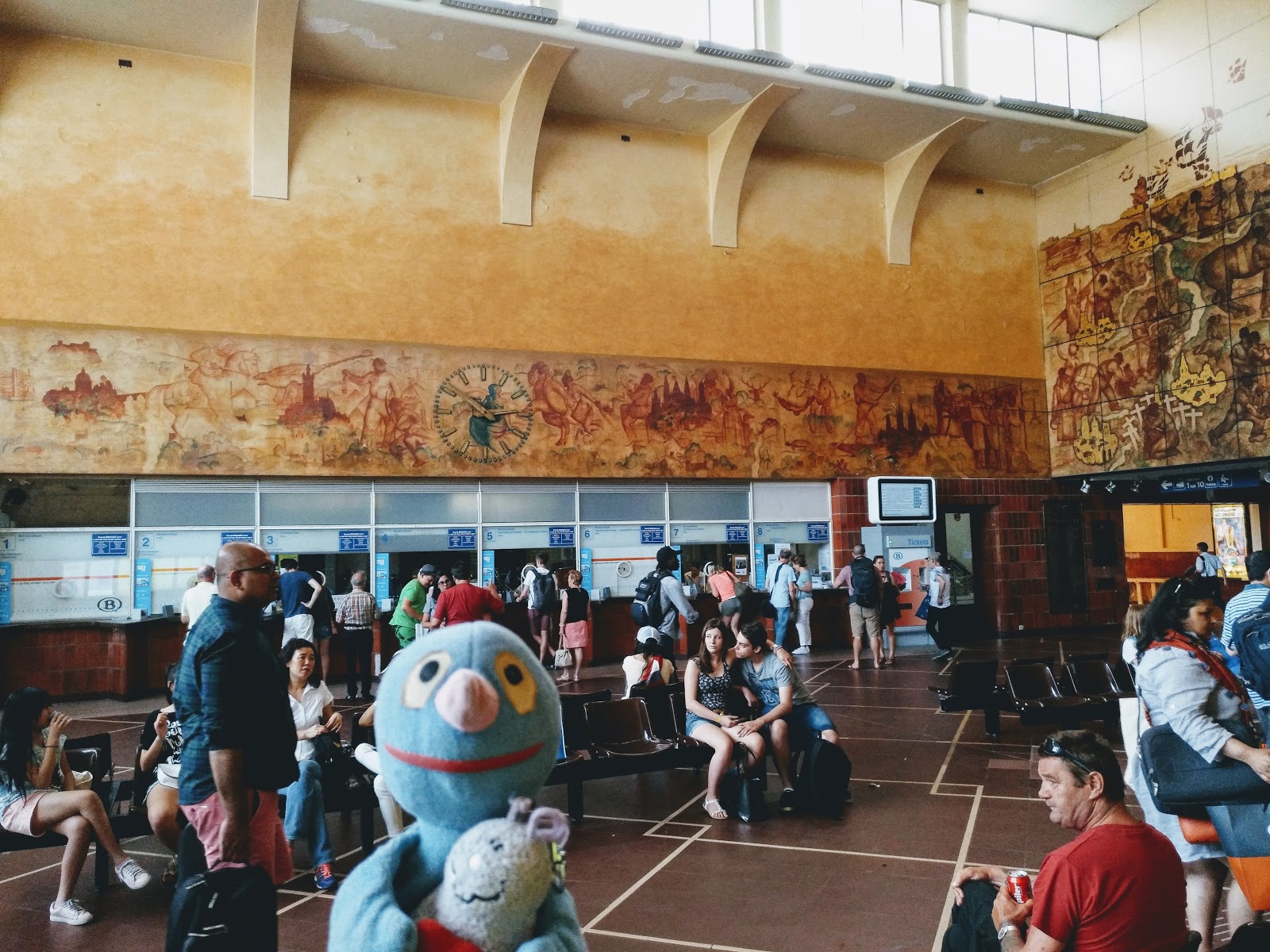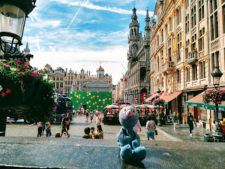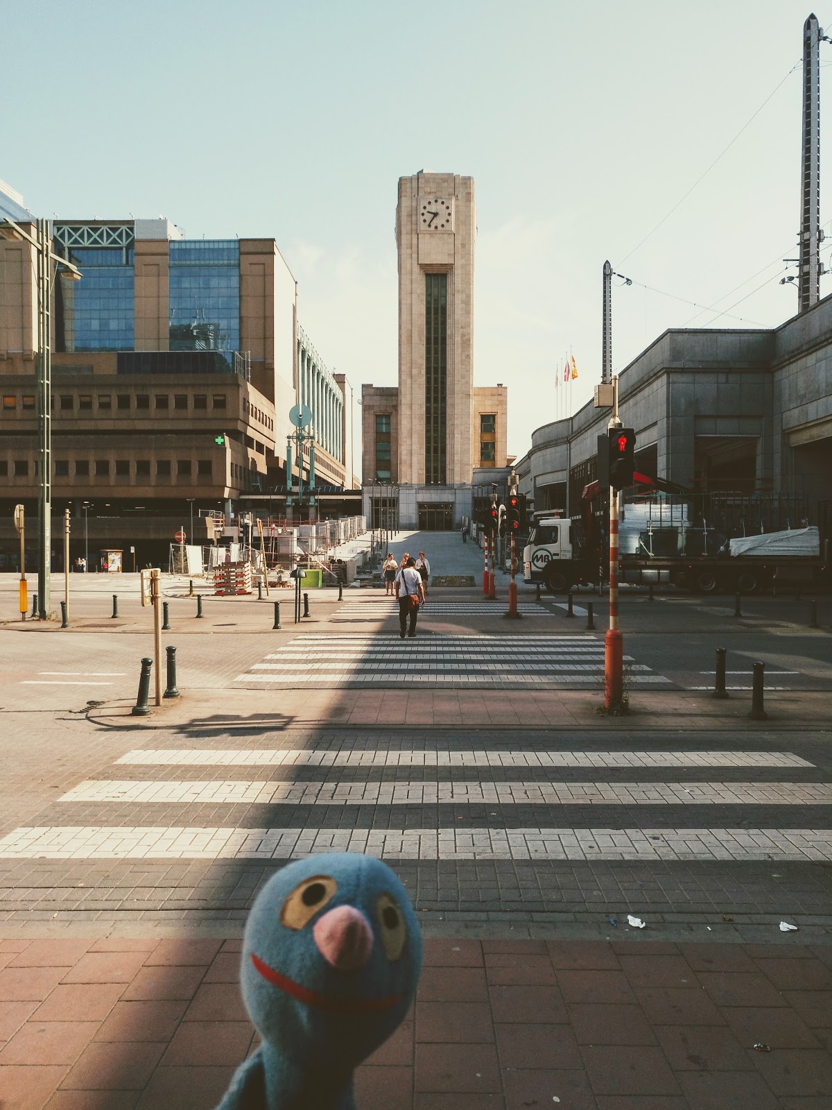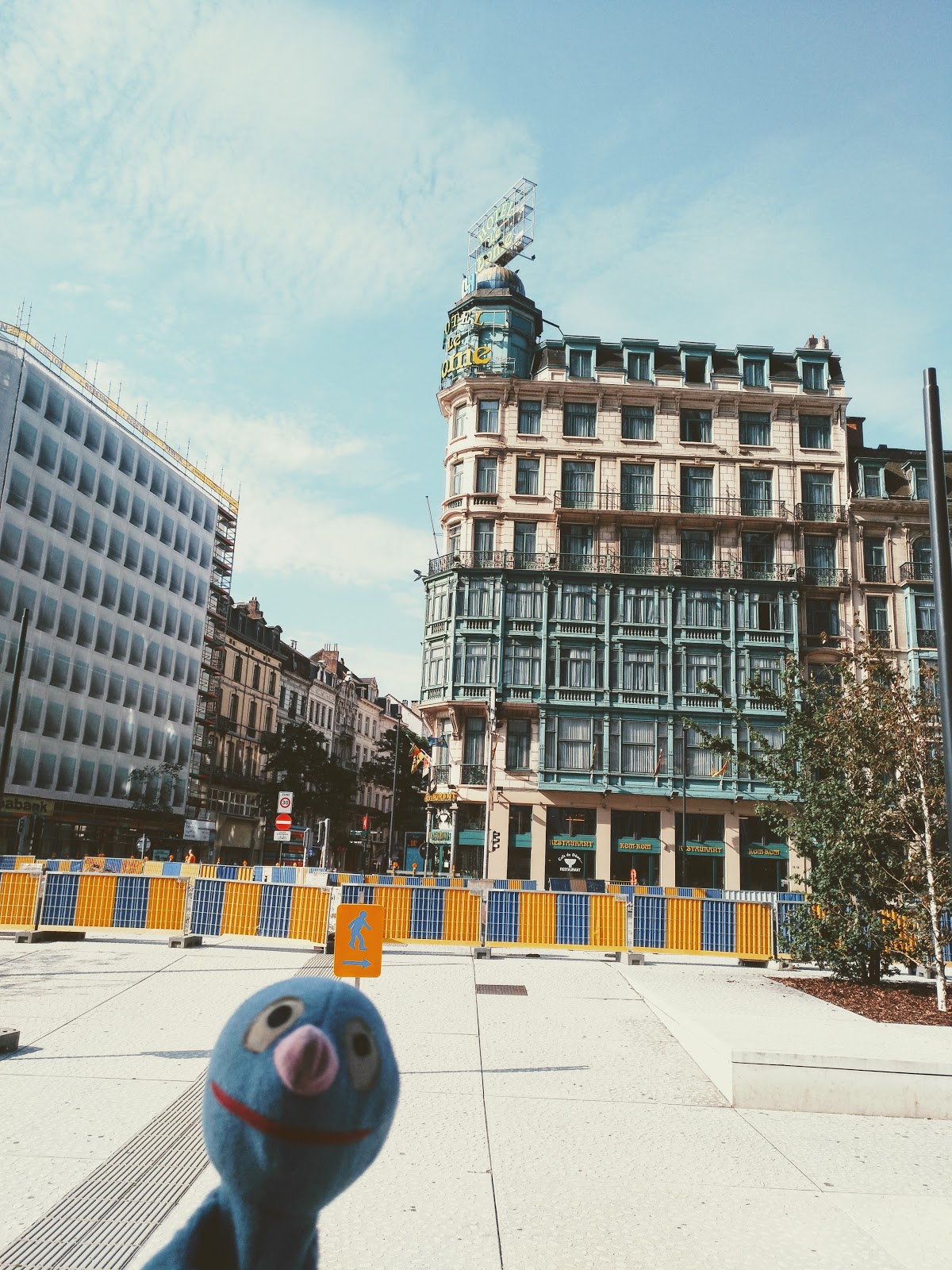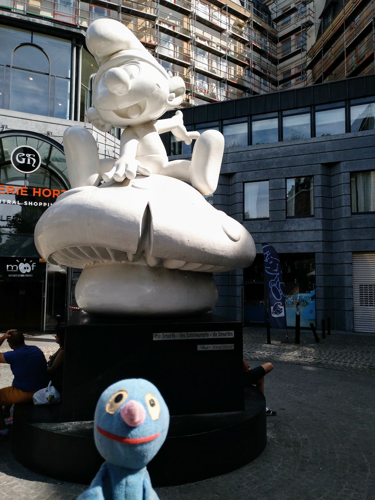 In Brüssel angekommen starteten wir unsere Speed-Sightseeing-Tour am Hauptbahnhof. Die ersten Meter um den Bahnhof herum waren wohl nicht besonders empfehlenswert und wurden von Schatzi-Moppel schnellstmöglich passiert. Als ich dann schließlich aus der Tasche geholt wurde, sah ich mich einem überlebensgroßen Riesenschlumpf gegenüber.