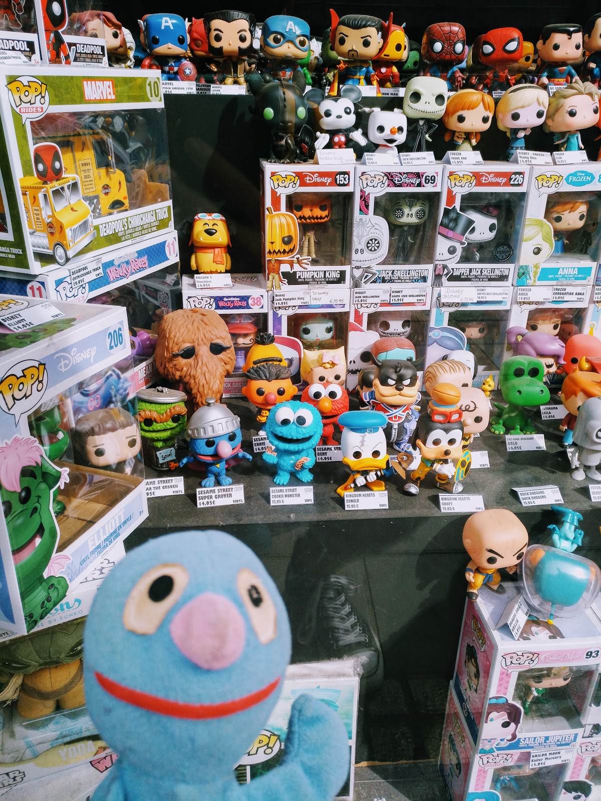 Unterwegs stolperten wir an einem Comicladen vorbei, in dessen Schaufenster allerlei Actionfiguren von (nicht nur, aber überwiegend) Superhelden standen. Darunter waren auch ein Supergrobi und ein Krümelmonster. Nach kurzer Diskussion erstand das Schatzi ein Krümelmonster, das schon seine eigenen Kekse dabei hatte. Clever eigentlich.