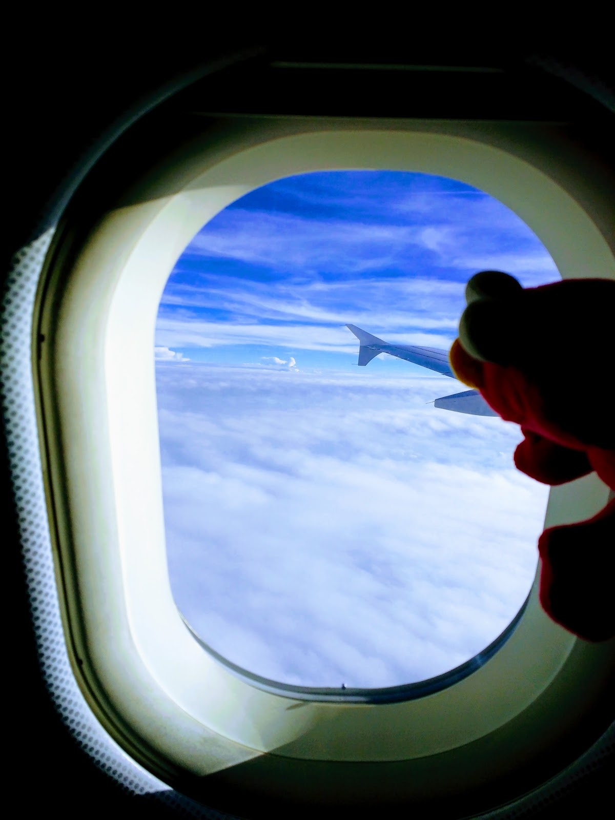 Als diese Probleme dann endlich behoben waren, ging es los. Dabei stellte sich heraus, dass weder Knuffi noch Elmo bisher geflogen waren und ein wenig Angst hatten. Sie wurden also aus der Tasche geholt und durften mit Schatzi-Moppel während des Fluges kuscheln. Beide haben sogar mutig aus dem Fenster geschaut.