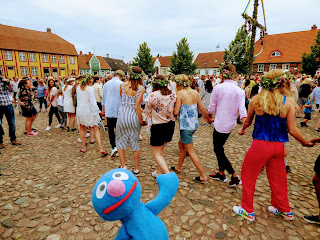 In der Mitte des Platzes gab es einen Midsommarbaum (ähnlich dem bei uns bekannten Maibaum), um den herum viele Schweden tanzten. Alle (sogar viele Männer) trugen Blumenkränze im Haar und waren in ausgelassener Stimmung.