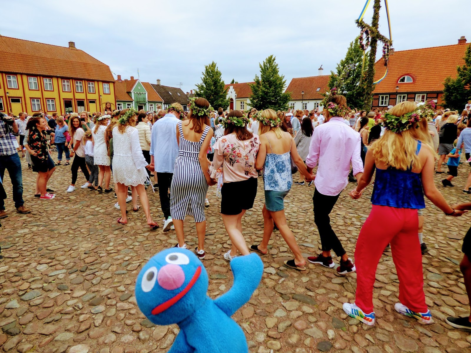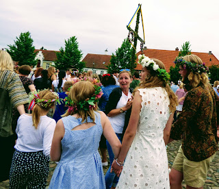 In der Mitte des Platzes gab es einen Midsommarbaum (ähnlich dem bei uns bekannten Maibaum), um den herum viele Schweden tanzten. Alle (sogar viele Männer) trugen Blumenkränze im Haar und waren in ausgelassener Stimmung.