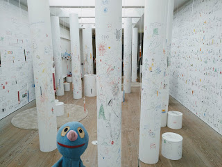 Was ich aber noch mit euch teilen möchte, ist der Mumin-Wald. Dieser war im obersten Stock des Gebäudes und bestand aus \“Bäumen\“ (Papierpfeiler und -wände) und \“Blättern\“ (von der Decke hängende Stifte). Außerdem lagen noch jede Menge Stifte herum. Die Bäume waren mit Mumin-Bildern bedruckt, die man ausmalen oder nach Herzenslust dazwischen malen konnte. Wir haben uns dort natürlich auch ein wenig ausgetobt.