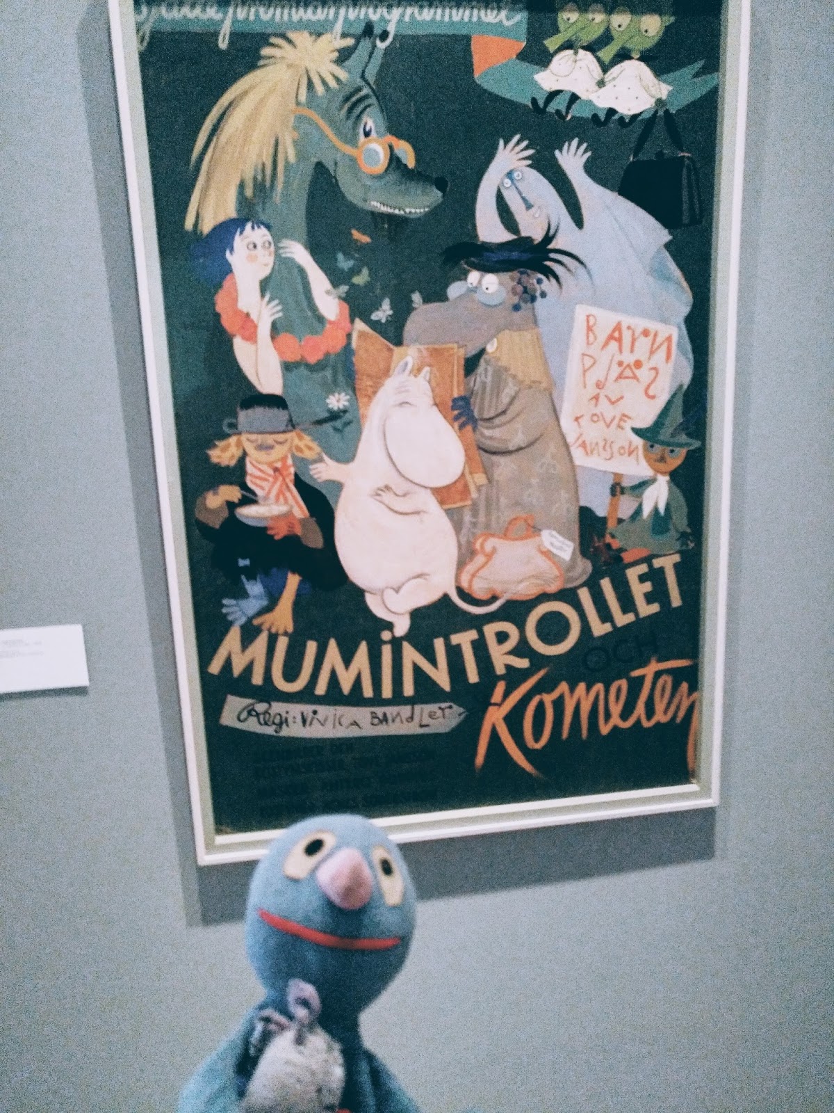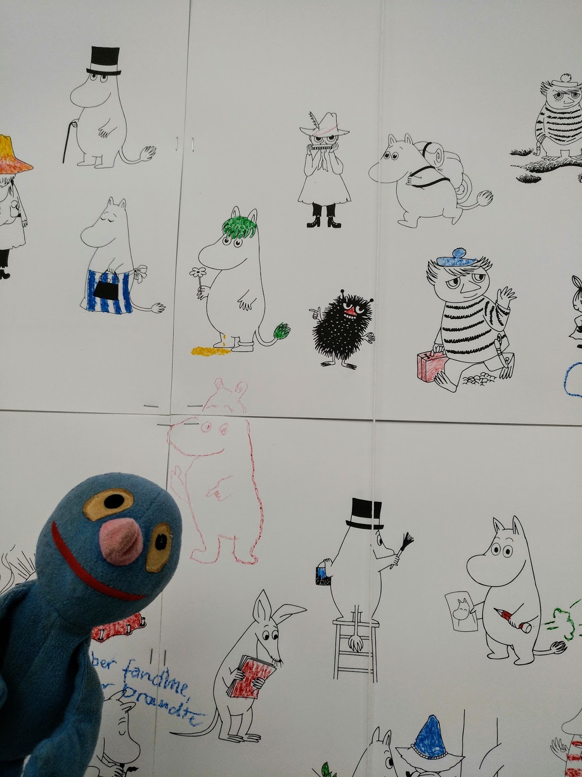 Wir waren ja ursprünglich durch ein Plakat auf diese Ausstellung von Tove Janssons Werken aufmerksam geworden, hatten dann aber den Eindruck, dass wir nicht genug Zeit hätten, sie zu besuchen. Wie es der Zufall wollte, sind wir dann aber zufällig vor der Galerie gelandet, wo die Ausstellung war und bei einem Blick in den Shop haben wir beschlossen, sie doch noch schnell anzuschauen. Es war eh nur noch eine kappe Stunde, bis sie schließen sollte und so waren wir hineingestolpert, total begeistert und mussten am Ende noch ein paar kleine Mumin-Souveniers kaufen (u.a. zwei Tassen, weil wir ja sooo wenig Tassen haben).