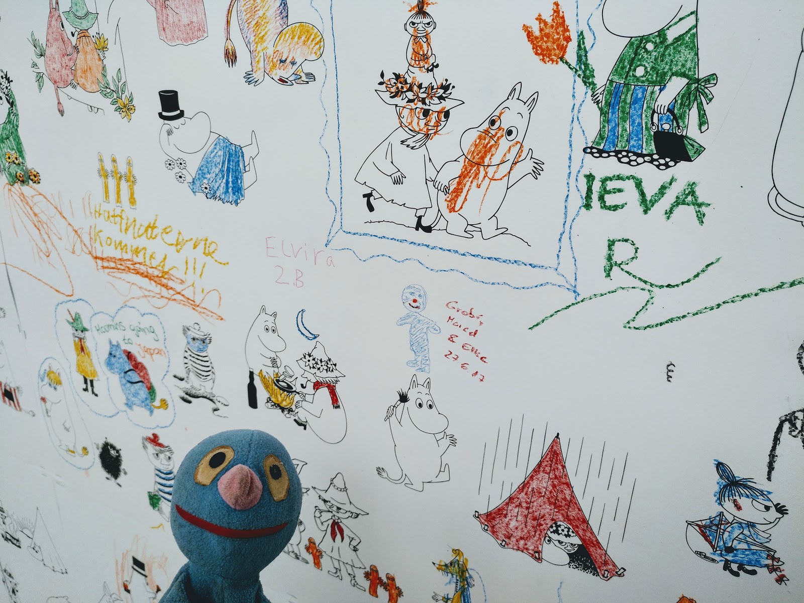 Was ich aber noch mit euch teilen möchte, ist der Mumin-Wald. Dieser war im obersten Stock des Gebäudes und bestand aus \“Bäumen\“ (Papierpfeiler und -wände) und \“Blättern\“ (von der Decke hängende Stifte). Außerdem lagen noch jede Menge Stifte herum. Die Bäume waren mit Mumin-Bildern bedruckt, die man ausmalen oder nach Herzenslust dazwischen malen konnte. Wir haben uns dort natürlich auch ein wenig ausgetobt.