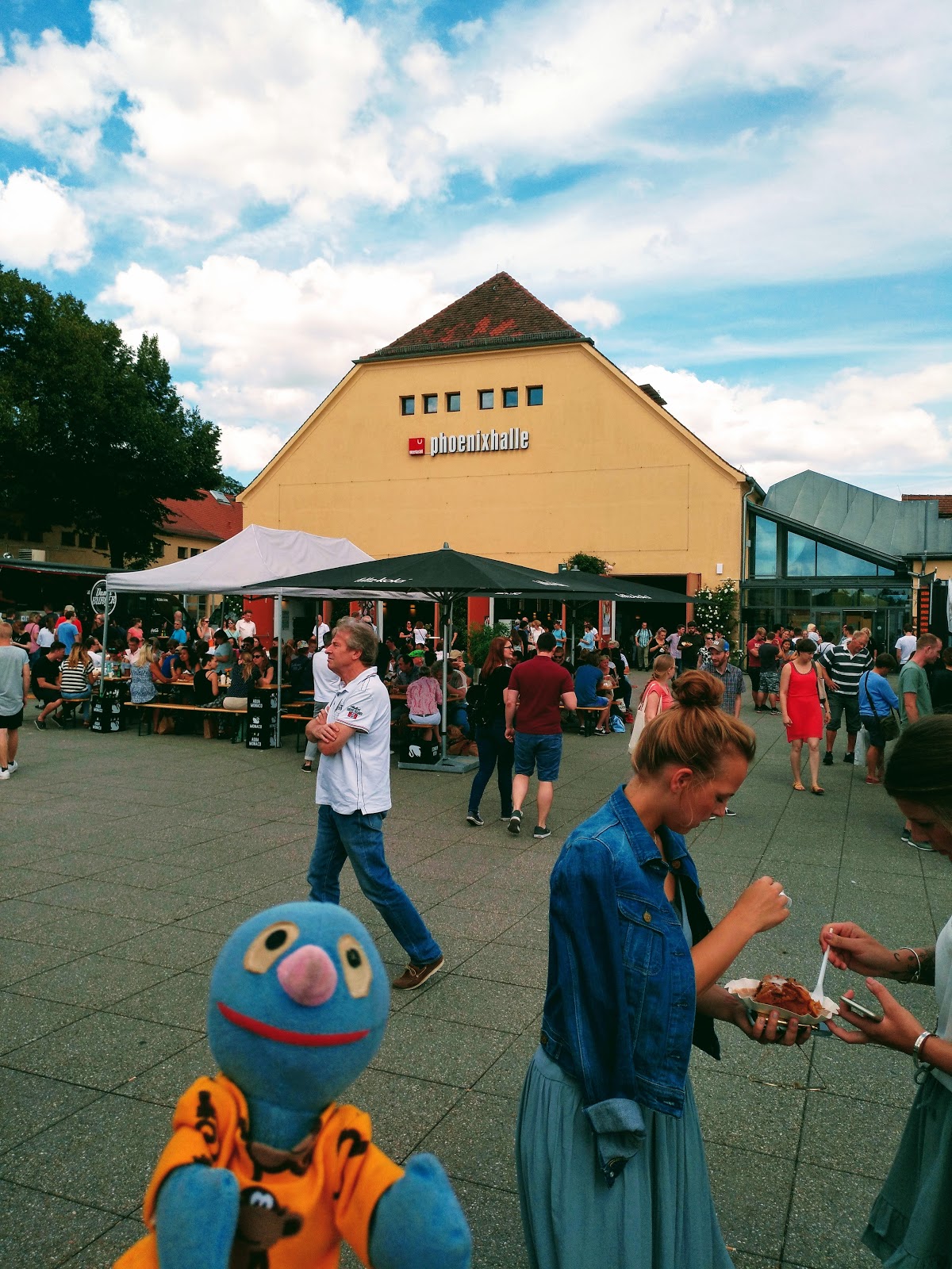 Schatzi-Moppel waren gleich mit fünf Leuten vor Ort verabredet. Nachdem wir alle gefunden und die recht kurze Schlange am Einlass passiert hatten (an dem jeder einen Foodist-Jutebeutel und eine kleine Packung Popcorn erhielt), haben wir uns zunächst kurz auf dem Vorplatz umgesehen, wo es verschiedene Essenstände gab.
