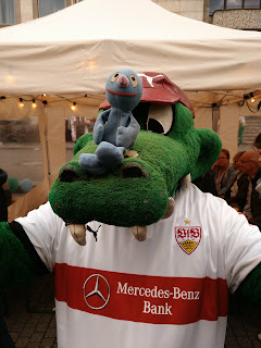 Als erstes haben wir das Fritzle erwischt. Das Fritzle ist das VFB-Maskottchen. Das ist zwar der falsche Verein, aber so nah bin ich an unseren Jünter noch nicht herangekommen.