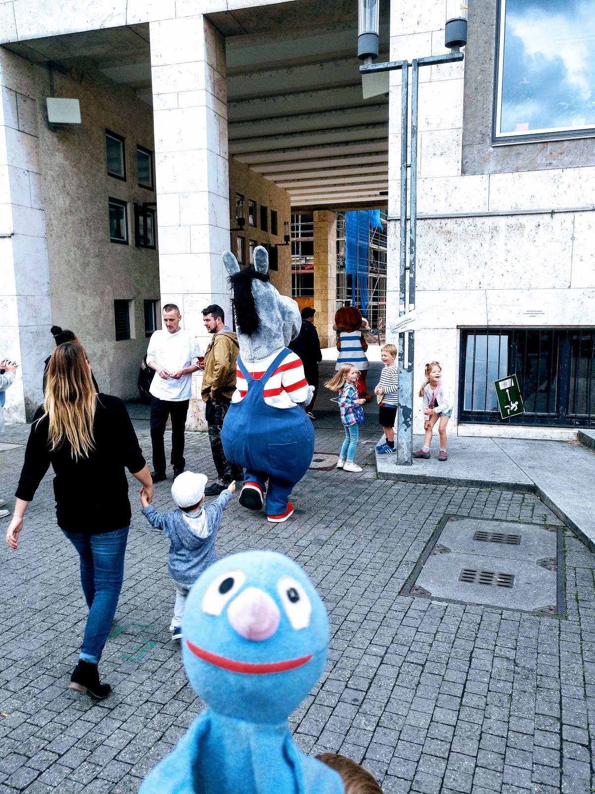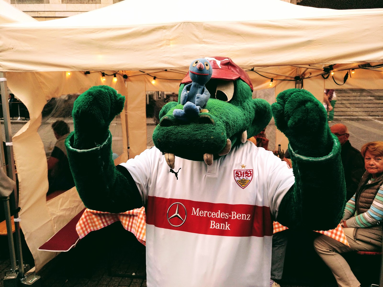 Als erstes haben wir das Fritzle erwischt. Das Fritzle ist das VFB-Maskottchen. Das ist zwar der falsche Verein, aber so nah bin ich an unseren Jünter noch nicht herangekommen.