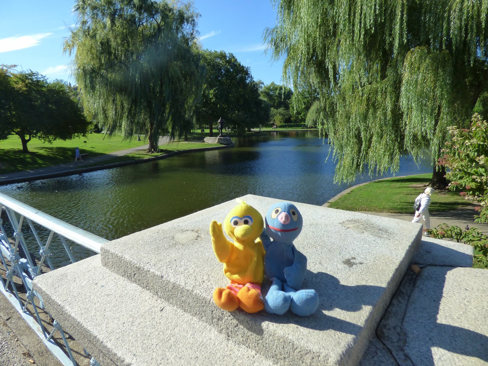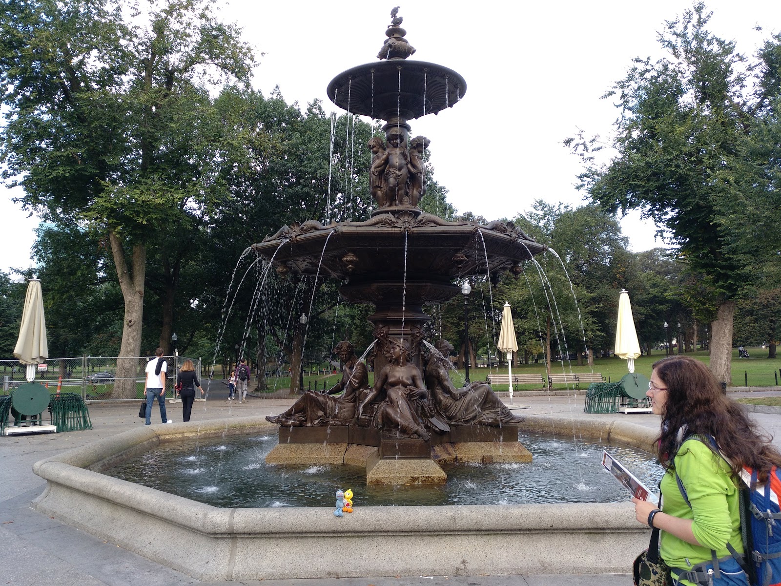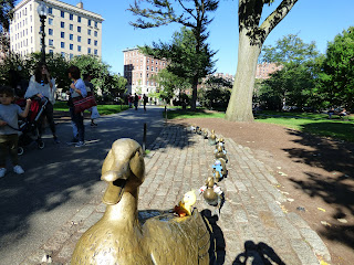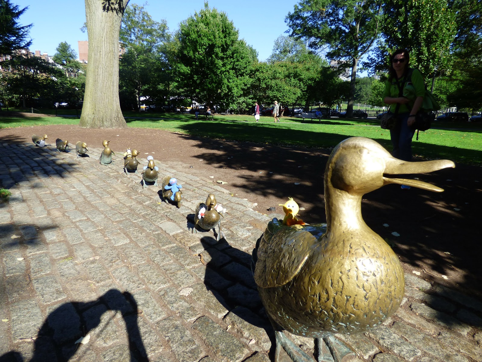 Ziemlich am Anfang befindet sich eine Gruppe mit Bronzeskulpturen: eine Entenfamilie (“Make way for ducklings“). Während wir hierauf Fotos gemacht haben, waren wir selbst eine kleine Attraktion.