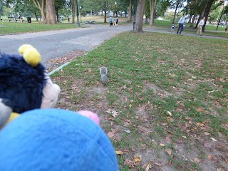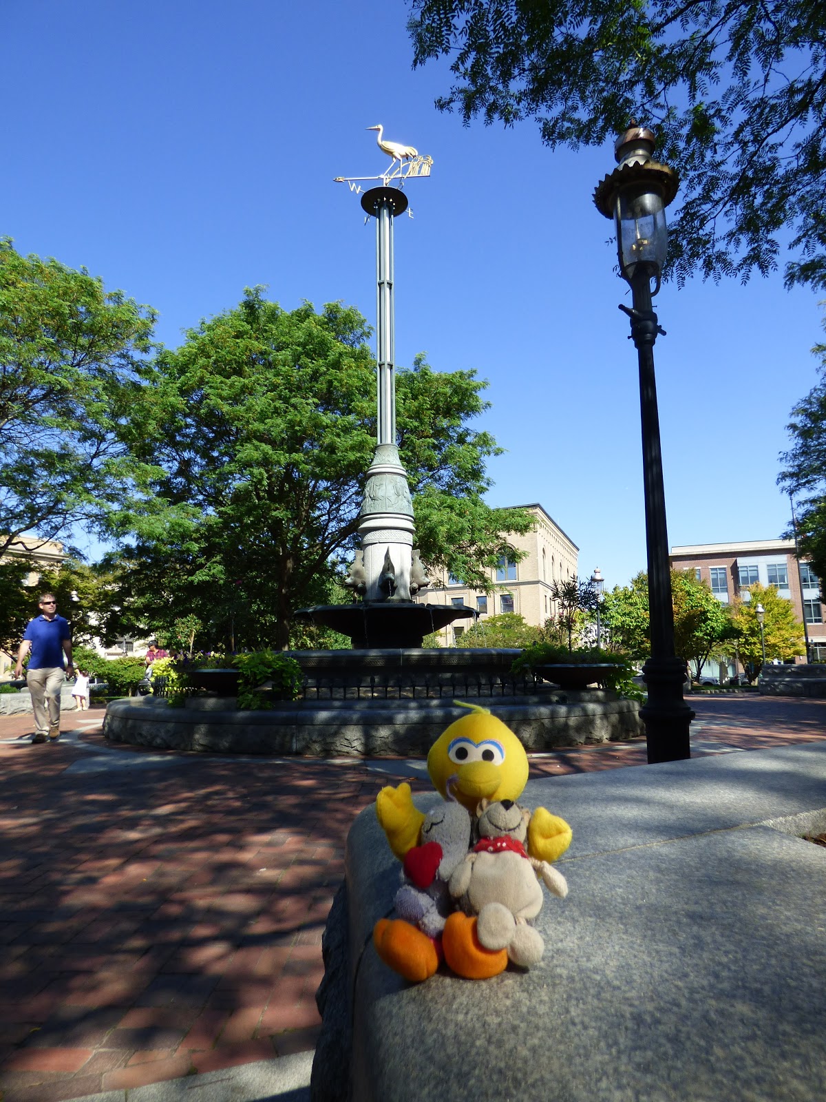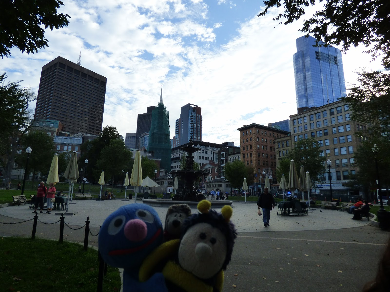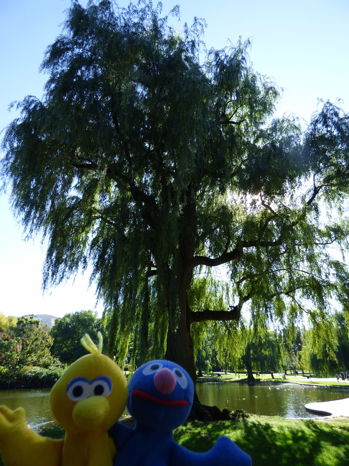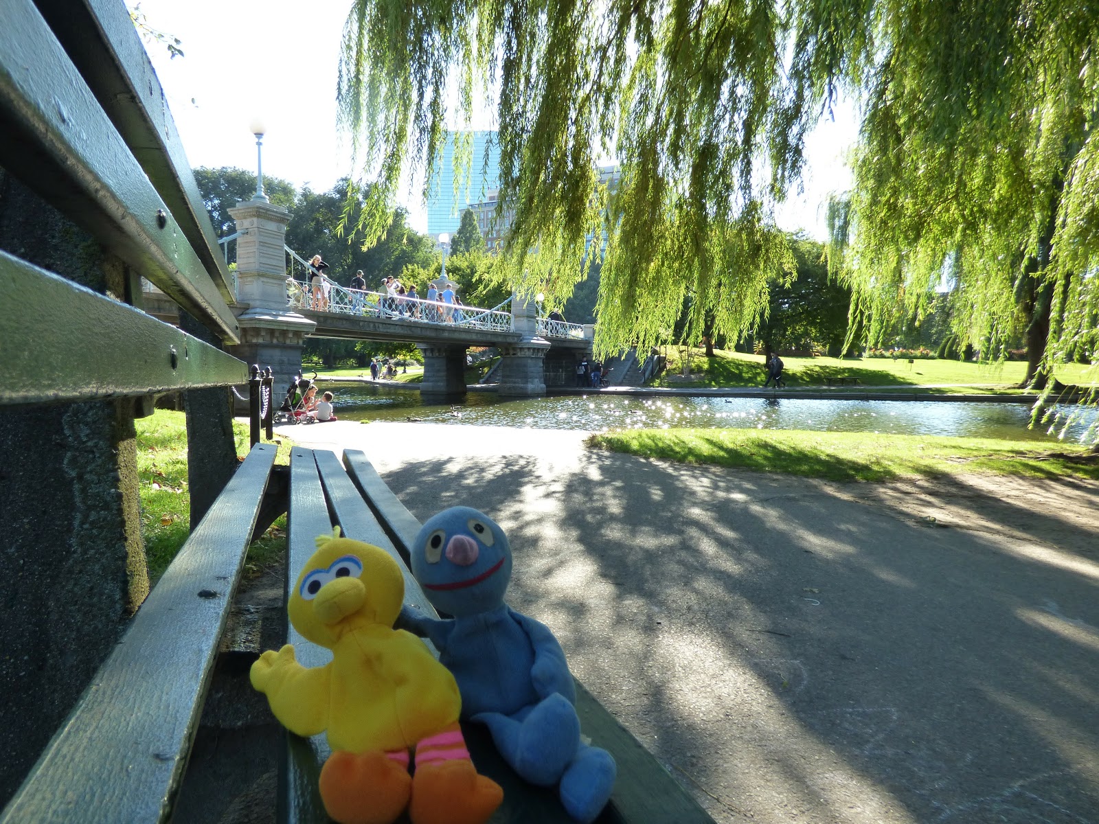 Ziemlich am Anfang befindet sich eine Gruppe mit Bronzeskulpturen: eine Entenfamilie (“Make way for ducklings“). Während wir hierauf Fotos gemacht haben, waren wir selbst eine kleine Attraktion.