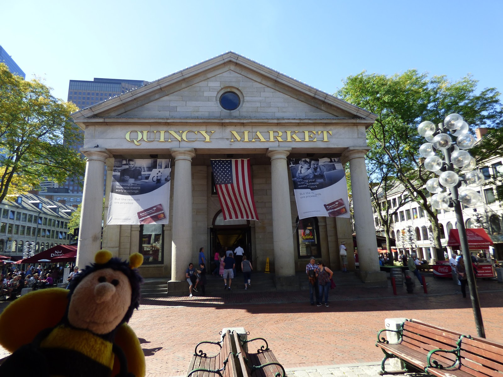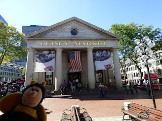 Die anschließende Boston Massacre Site, eine Platte im Boden, haben wir irgendwie übersehen. Nicht zu übersehen war dagegen die Faneuil Hall, erbaut im Jahr 1741 als erster öffentlicher Versammlungsort, wird er auch als “Home of the free speach“ (Heimat der freien Rede) und “cradle of liberty“ (Wiege der Freiheit) bezeichnet. Hinter der Faneuil Hall liegen drei Markthallen, in denen um diese Zeit aber noch nicht viel los war.