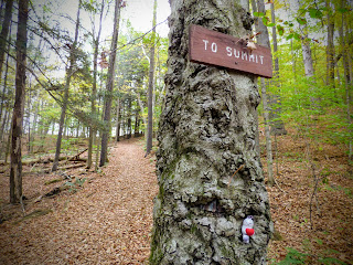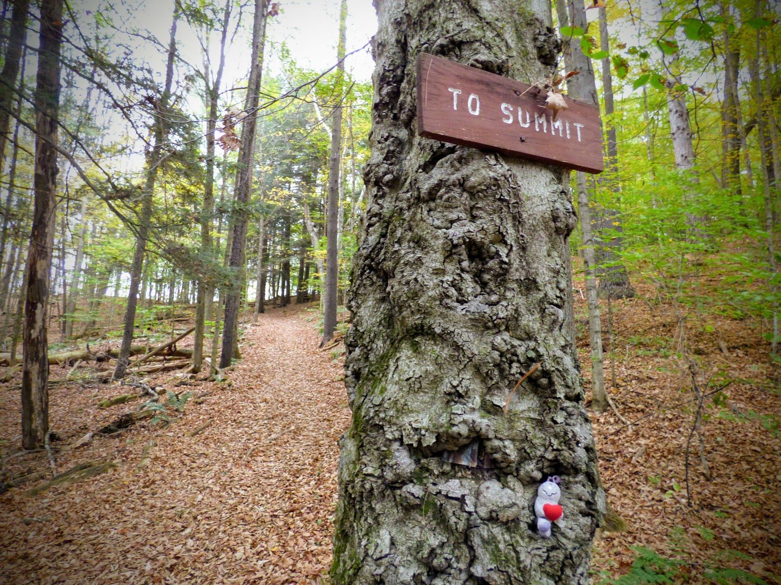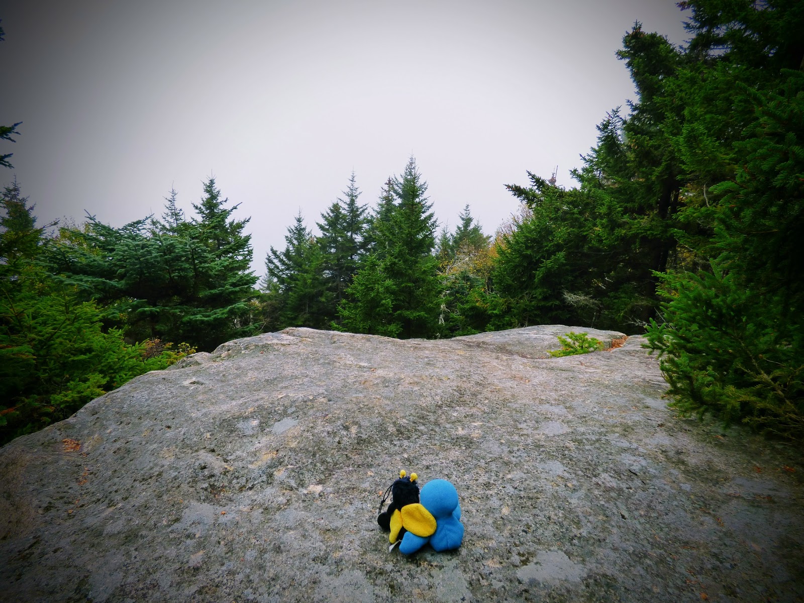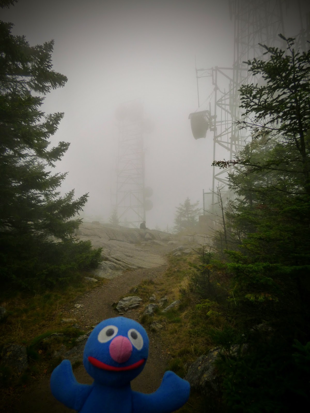 Nach einer Fotopause ging es wieder zurück zum Auto. Als nächstes wurde der Mount Ascutney angesteuert, der etwas über 3000 Fuß hoch ist. Hier wollten wir zwei Wasserfälle besuchen. An der Einfahrt zum Park hat das Schatzi die Gebühr gezahlt und hat dem Moppel die “Anweisung“ des Rangers weitergegeben, durch das gelbe Tor zum Parkplatz zu fahren. Leider kam aber nach dem gelben Tor für lange Zeit kein Parkplatz, stattdessen ging es stetig bergauf. Am Ende der Straße waren wir dann auf dem Gipfelparkplatz und weniger als eine Meile vom Gipfel entfernt. Also geht man halt mal hin. Es war allerdings total neblig und kalt. Der Gipfel war vollkommen verhangen und quasi nicht zu sehen. Naja, schön ist anders.