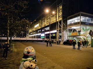 Unsere Plätze waren auch toll. Vierte Reihe neben der Eckfahne. Unweit zur Arnheimer Fankurve. Vor uns haben sich die Ersatzspieler warm gemacht und drei von vier Bällen sind hier ins Tor gerollt, wobei nur einer davon gezählt hat. Und das Dach war geschlossen, sodass es gar nicht so kalt war.