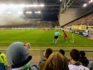 Im Spiel war auch alles dabei: Ein bisschen Pyrotechnik der Gästefans (die wegen des geschlossenen Daches nur schwer abgezogen ist), zwei gelb-rote Karten, zwei Tore der Gastmannschaft, zwei Tore der Heimmannschaft, die nicht gezählt haben und eine Fankurve, die den Linienrichter nicht mochte und ihn ironisch ausgeklatscht hat.