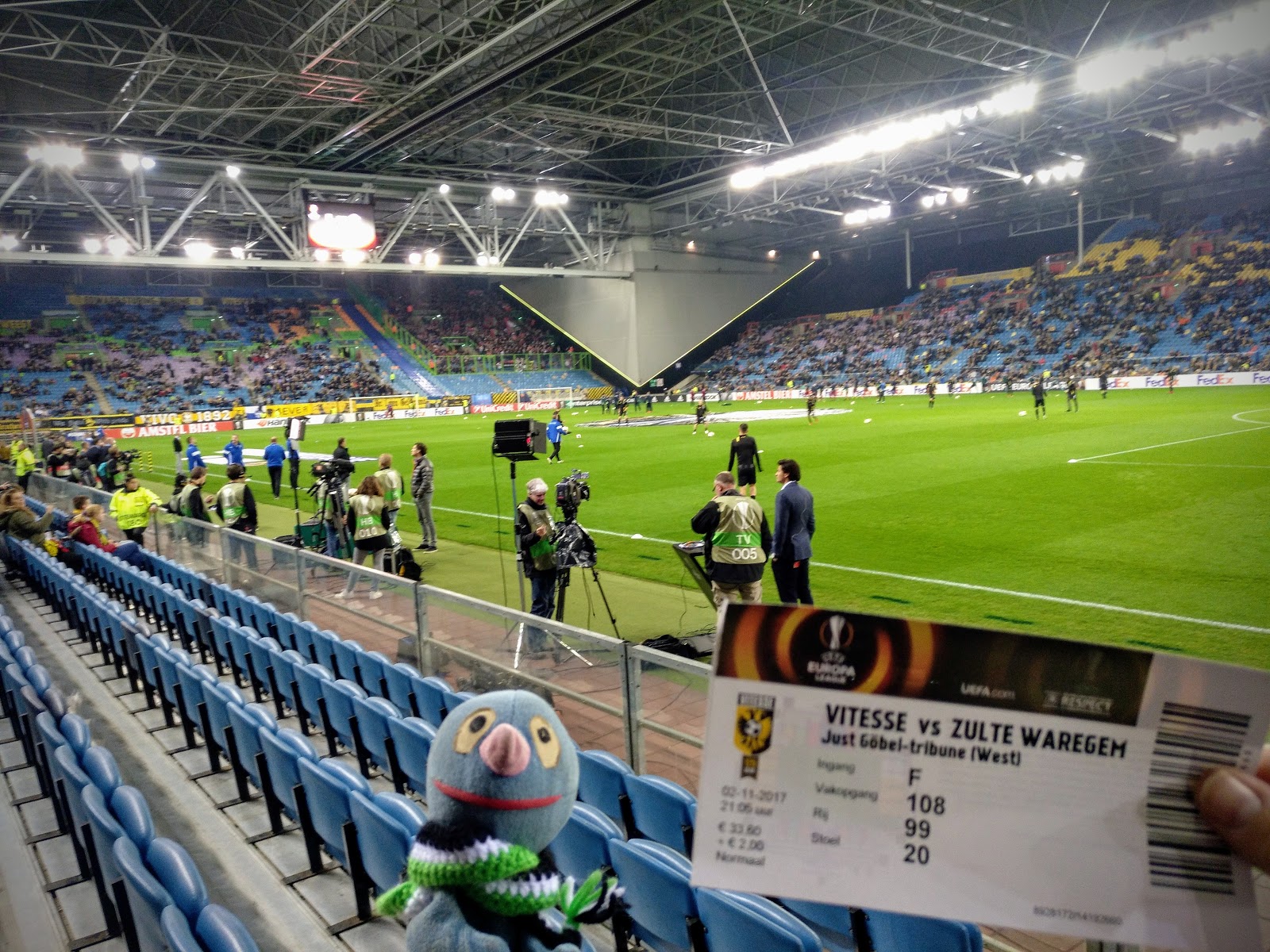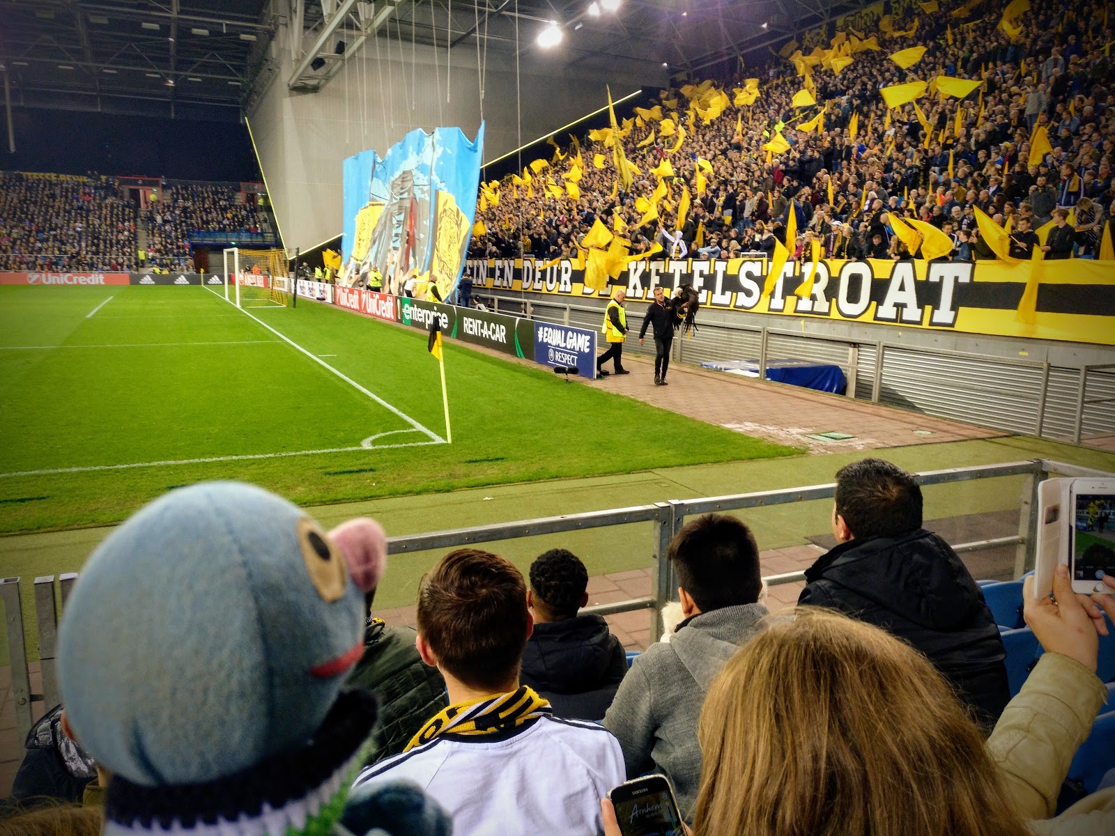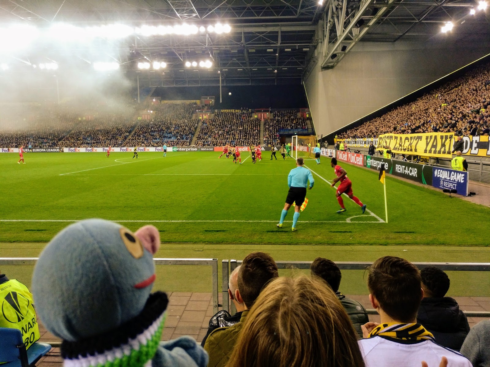 Unsere Plätze waren auch toll. Vierte Reihe neben der Eckfahne. Unweit zur Arnheimer Fankurve. Vor uns haben sich die Ersatzspieler warm gemacht und drei von vier Bällen sind hier ins Tor gerollt, wobei nur einer davon gezählt hat. Und das Dach war geschlossen, sodass es gar nicht so kalt war.