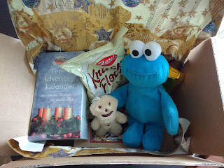 Das Päckchen war von der Mutti vom Schatzi und hat dem Krümel ganz besonders gut gefallen. Er hat zwar das Papier und den Tee-Adventskalender gleich herausgeworfen, aber die Süßwaren, die sich darunter versteckt haben, kamen sehr gut bei ihm an.