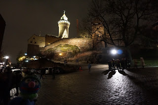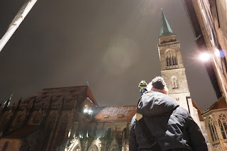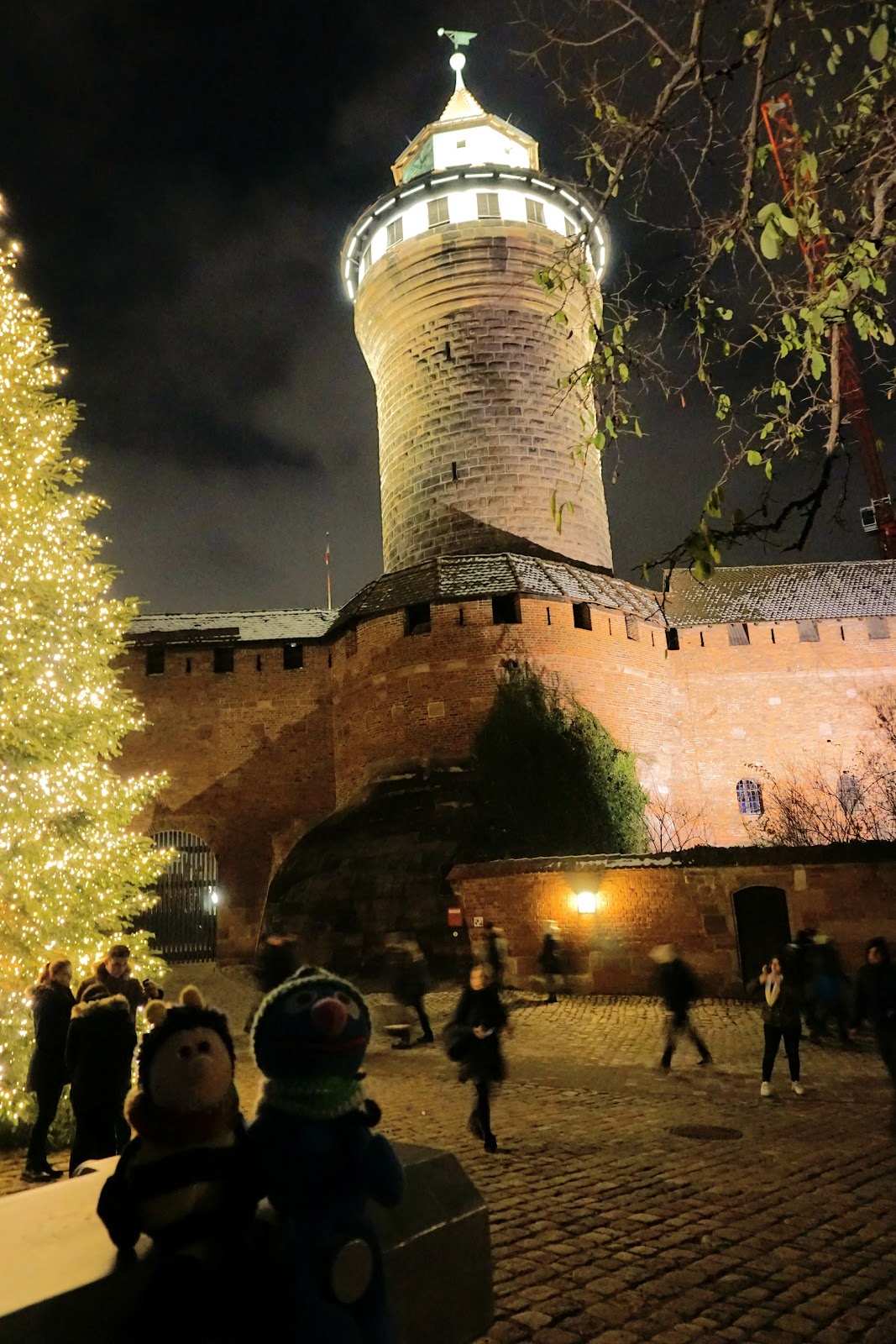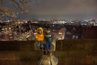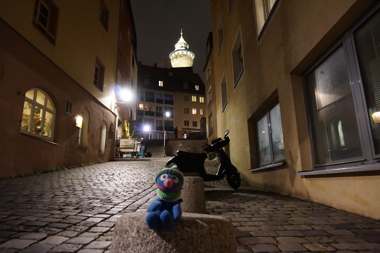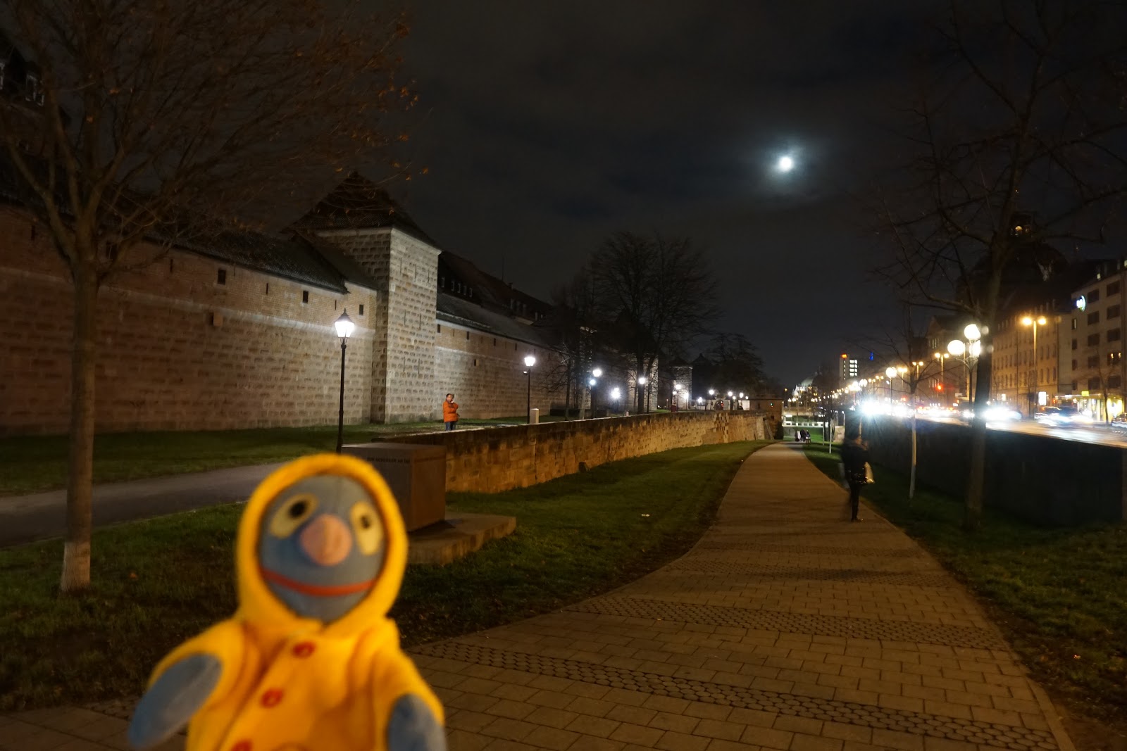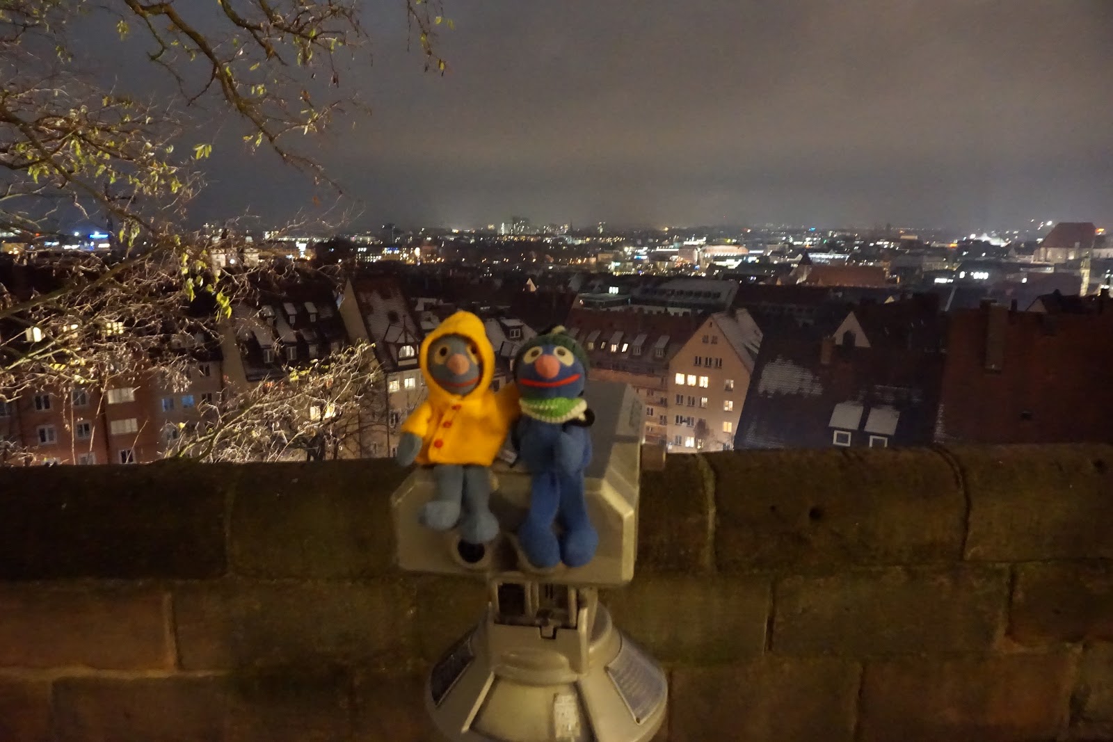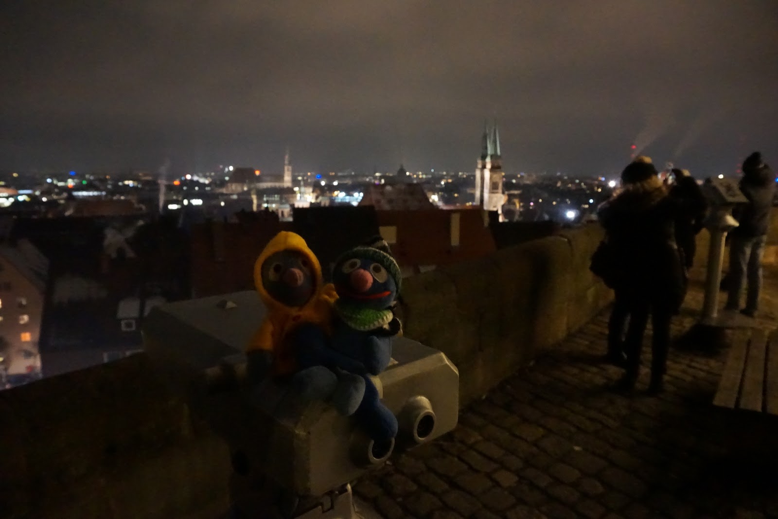 Von hier hatte man einen schönen Blick auf das nächtliche Nürnberg und wir haben versucht, das fotografisch festzuhalten, was nicht so leicht war. Ein Versuch mit dem Handy hat aber gezeigt, dass man gar nichts auf dem Foto gesehen hätte.