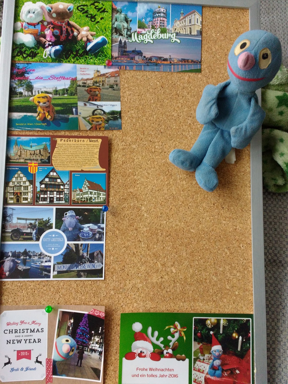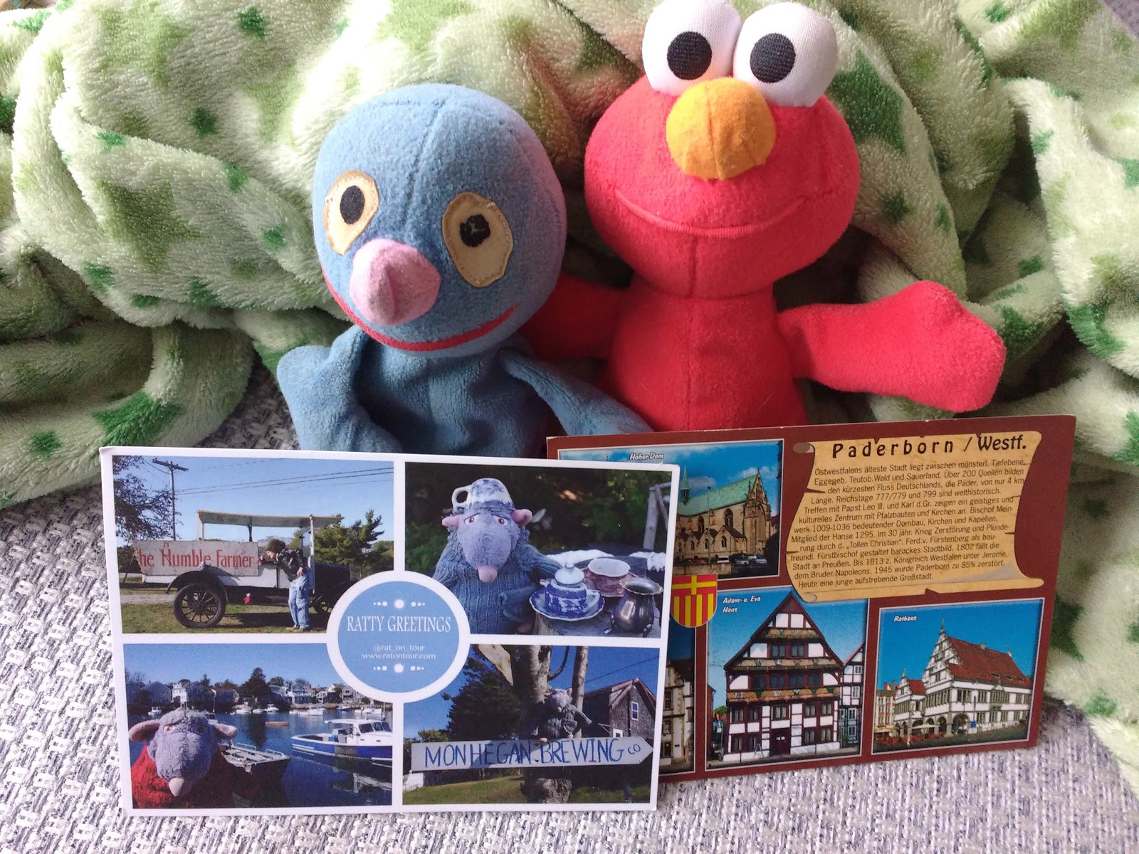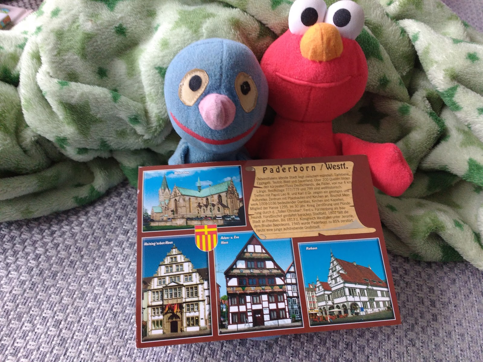 Danach sind wir zurück ins Hotelzimmer gegangen und haben noch gemeinsam das aktuelle Sportstudio geguckt. Nach einer halbwegs guten Nacht, die nur von komischen Lichtern gestört wurde, sind wir heute morgen nach dem Frühstück wieder nach Hause gefahren. Zu Hause erwarteten uns natürlich alle Kuschelfreunde aber auch zwei nette Postkarten und ein kleines Paket. Eine Postkarte war von den drei Ratten, denen wir auf Instagram begeistert folgen, und die andere von Willy, der uns aus Paderborn geschrieben hat. Er hat sich scheinbar unsterblich in ein rosanes Plüschschwein verliebt. Also, dafür hätte er ja nicht wegfahren müssen, so was haben wir schließlich auch!