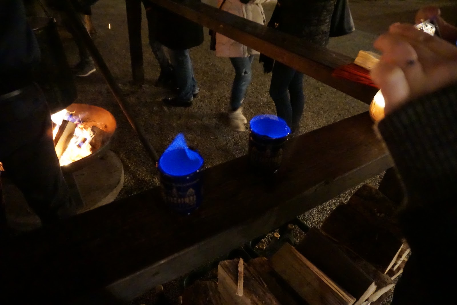 Irgendwann sind wir auf dem Weihnachtsmarkt angekommen, wo es erstmal einen Flammlachs gab. Auf Bratwurst hatte irgendwie niemand mehr Lust, zumal die ja auch bekanntlich in Baden-Württemberg nicht so richtig schmeckt. Außerdem wurde ein Eierpunsch nach Oma\’s Rezept getrunken, der es ganz gut in sich hatte.