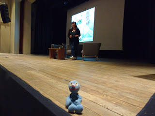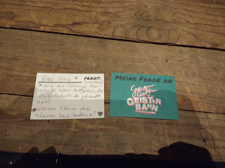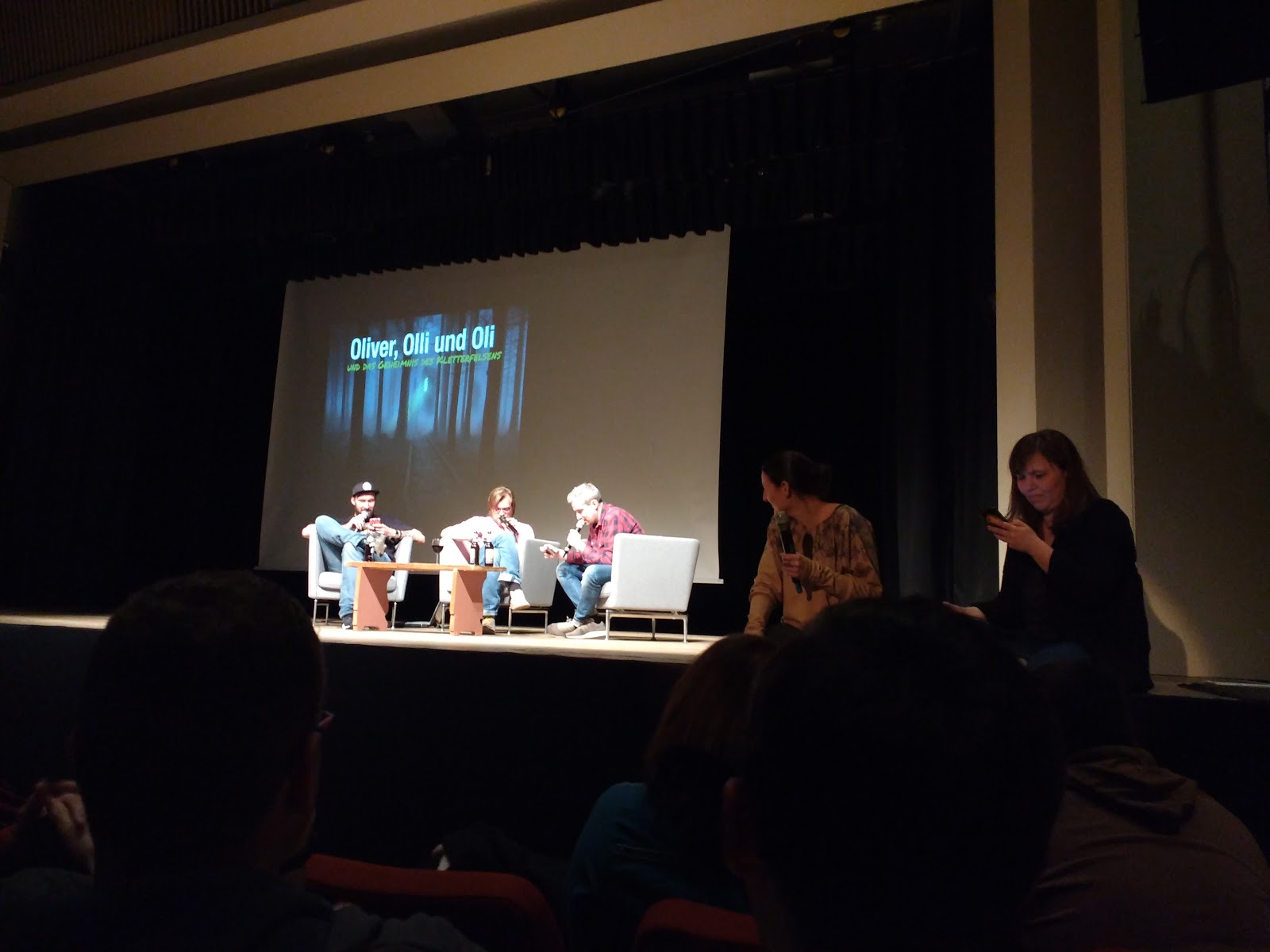 Nach einer Weile Wartezeit, in der wir schon mal unsere Fragen aufgeschrieben haben, ging es endlich los mit Gästeliste Geisterbahn – in Person von Nilz Bokelberg, Markus Herrmann und Donnie O\’Sullivan. Wir haben uns vom ersten bis zum letzten Moment furchtbar gut amüsiert und ich durfte sogar auf dem Schoß vom Schatzi sitzen und zuschauen. Genial. In der Pause haben wir unsere Fragekärtchen auf die Bühne gelegt und ich habe schnell mal für ein/zwei Fotos darauf posiert. Wir haben es sogar geschafft, Maria, die wichtigste Frau hinter den drei Quatschköpfen, mit auf ein Foto zu bekommen.