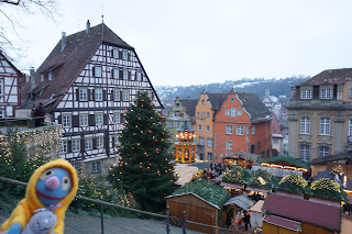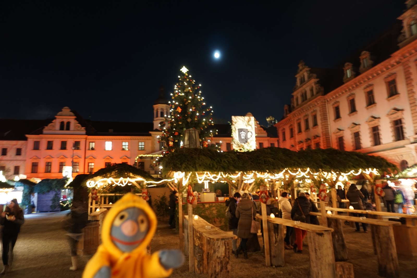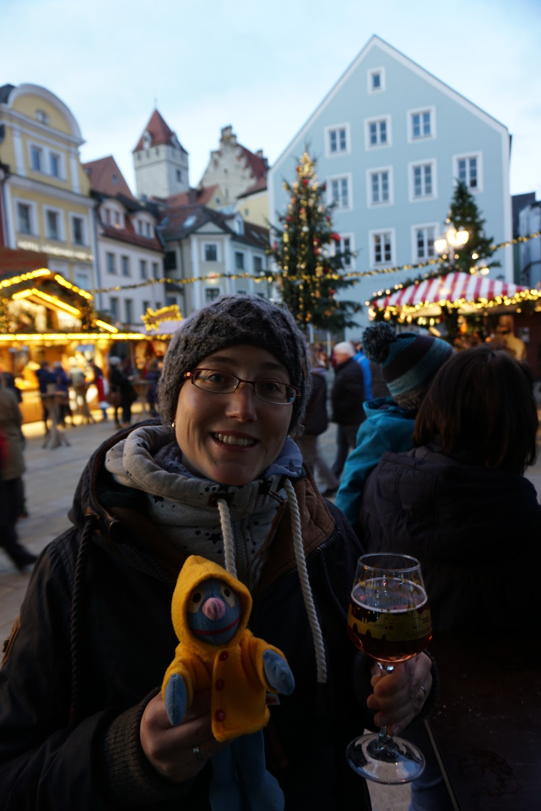 Direkt hinter dem Bahnhof startete schon der erste Weihnachtsmarkt. Hier haben Schatzi-Moppel erstmal einen Glühwein getrunken und jeder drei Würstle im Weckle gegessen.