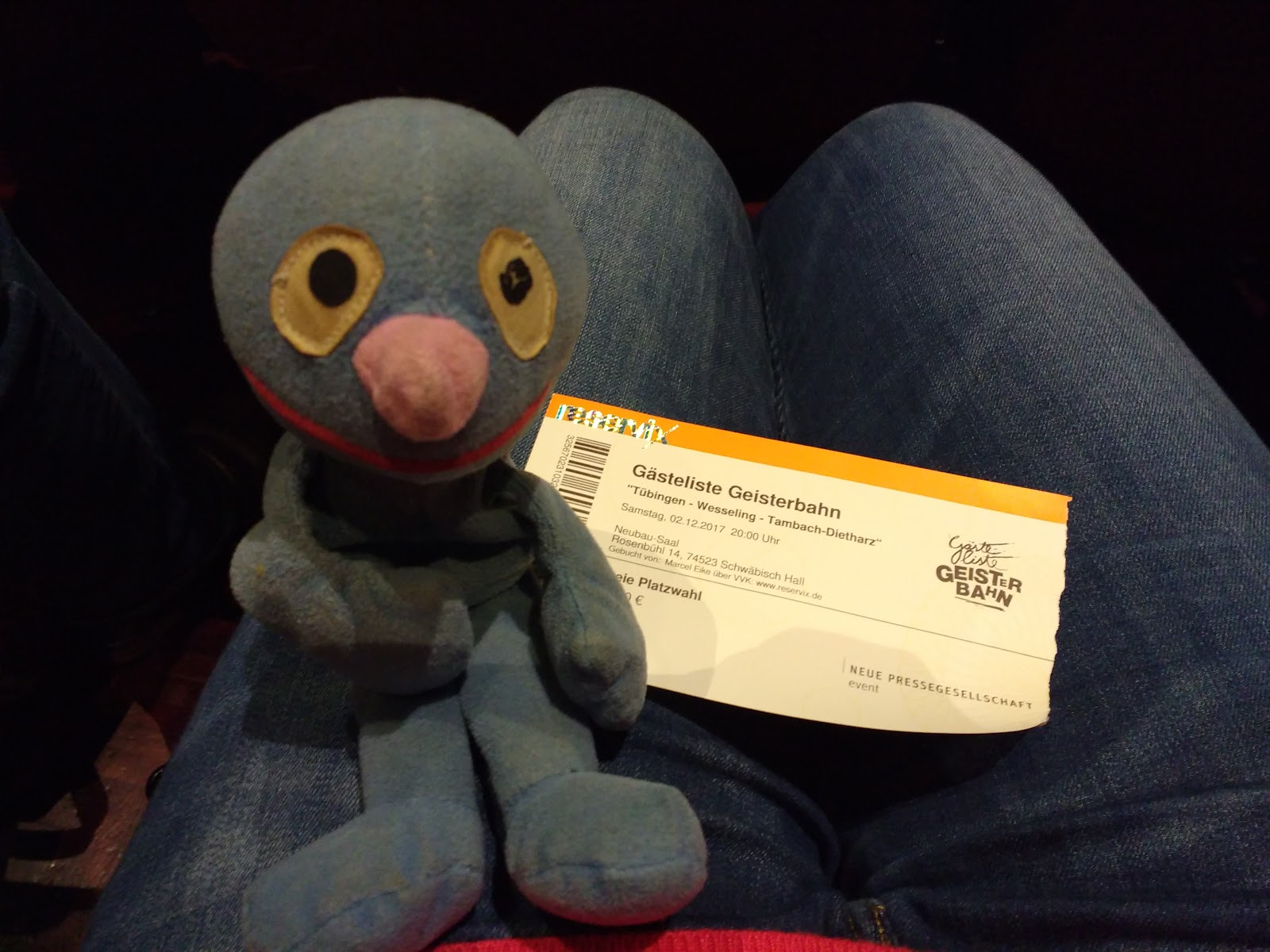Als wir losgezogen sind, war unser erster Stopp nochmal der Weihnachtsmarkt für eine weitere Stärkung (diesmal gab es zwiebelfreien Flammkuchen und einen Glühwein). Danach haben wir uns auf die Suche nach dem Neubausaal gemacht, dessen Eingang ein bisschen versteckt war. Wir haben ihn trotzdem gefunden und uns im Saal erstmal Plätze ausgesucht. Diese waren dann in der dritten Reihe – beste Sicht also.