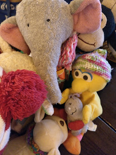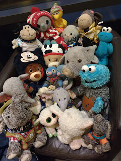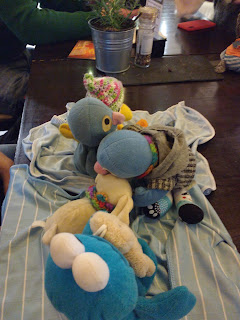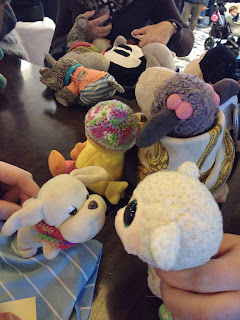 Schließlich haben wir uns also am Frankfurter Bahnhof getroffen, zunächst mit Krümels Familie, die Willy als Erkennungsmerkmal hochgehalten haben. Ein paar Schritte weiter trafen wir dann auf die Fantenbande, eine sehr große Gruppe überwiegend aus Elefanten, aber nicht nur. Lämmlein Molly, zwei Schäfchen und ein paar Bären waren auch dabei. Gemeinsam sind wir in das Restaurant vom Kaufhof gegangen und haben uns einen großen Tisch gesucht, wo wir alle Platz hatten. Die Menschen haben erstmal etwas gegessen und getrunken, während wir Plüschis schon mal eine Vorstellungs- und Kennenlernrunde gemacht haben. Dabei wurden schnell Sympathien festgestellt und Freundschaften geknüpft.
