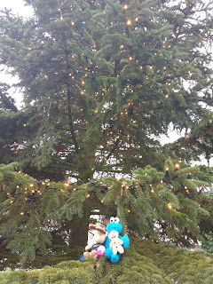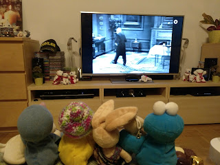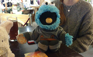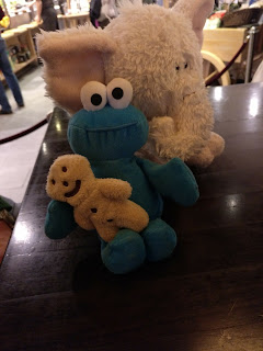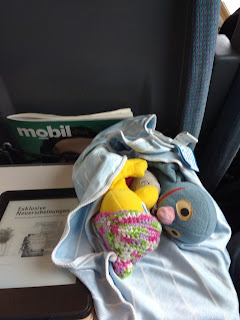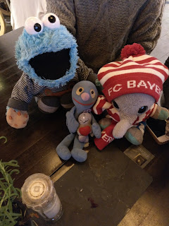 Aber nicht nur Willy wiederzusehen, war ein Highlight an diesem Tag, sondern auch das Plüschi-Treffen an sich. Wir haben uns zwar schon mal mit einem Krümelmonster getroffen (in Gladbach am Stadion, was auch super toll war), aber das Treffen damals war leider nur sehr kurz. Diesmal war mehr Zeit eingeplant und es waren auch richtig viele Plüschis dabei. Unsere Abordnung bestand aus mir, Bibo und Kuschel, Knuffi, (unserem) Krümel und Ginger. Auf dem Weg nach Frankfurt haben wir versucht, uns noch ein bisschen zu erholen, was angesichts der Aufregung gar nicht so leicht war.