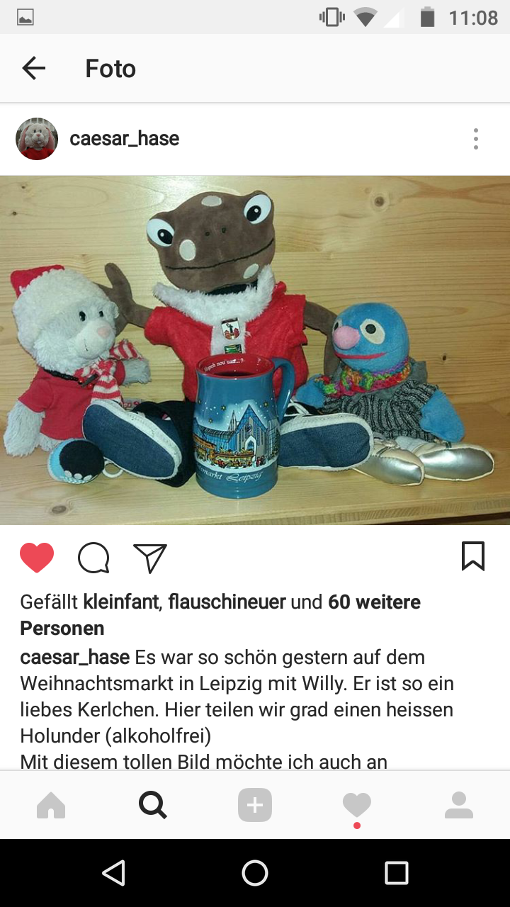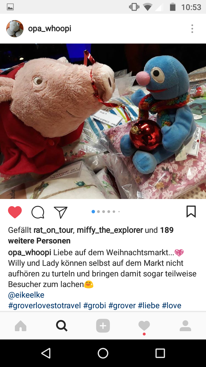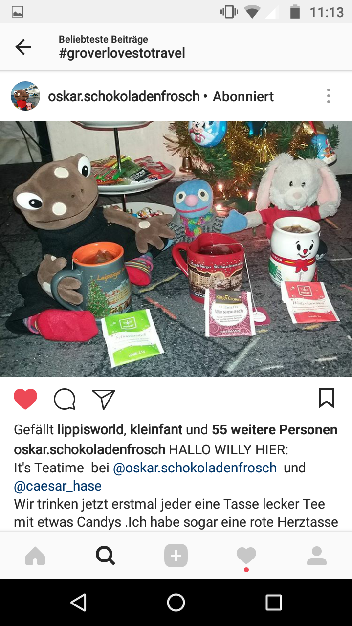 Am 30.12.2017 fuhren wir gegen Mittag mit dem Zug nach Frankfurt. Dort waren wir mit Plüschi-Freunden von Instagram verabredet. Wir wollten uns am Hauptbahnhof treffen und waren alle ganz schön aufgeregt. Das Besondere war nämlich, dass wir nicht irgendwen getroffen haben (wobei unsere Freunde alle total toll sind und wir uns über jeden bei diesem Treffen gefreut hätten), aber bei diesem Treffen war Willy dabei. Ihr erinnert euch ja noch an Willy, Grobi Nr. 4, der gerade auf Reisen ist. Inzwischen ist er an seiner dritten Station in der Nähe von Frankfurt angekommen.